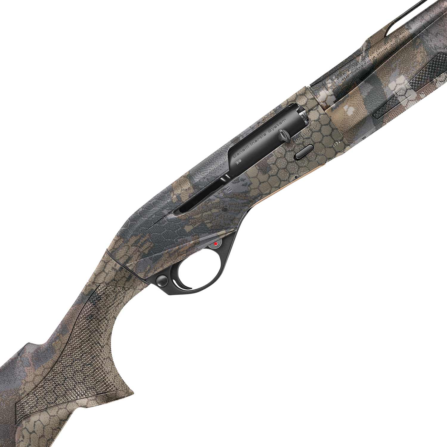 Description: Benelli M2 Shotgun, 12ga., Optifade Timber, 26" Barrel. This high-quality 12 gauge Benelli semi-auto shotgun is chambered for 3" 12 gauge shells and is a workhorse in the field. The M2 features a 26" steel barrel with a synthetic stock and forend set all boasting an Optifade Timber camouflage pattern. The shotgun utilizes the Crio System of choke tubes and a red bar front sight is installed to help line up those shots. Add this inertia-driven M2 shotgun to your collection and experience the reliable performance a Benelli shotgun can offer.