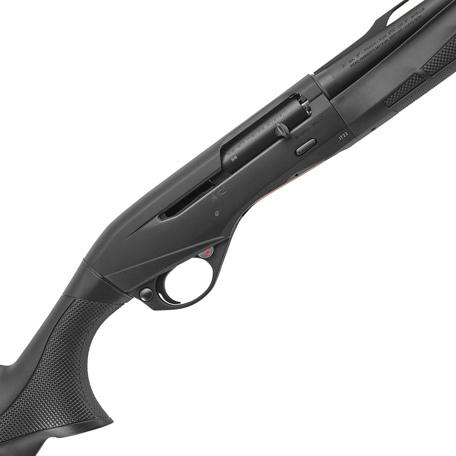 Description: Benelli M2 Compact Shotgun, 20ga., Black Synthetic, 24" Barrel. This high-quality Benelli semi-auto shotgun is chambered for 3" 20 gauge shells and is a compact workhorse suitable for the field. The M2 features a 24" steel matte blued barrel with a black synthetic forend and compact stock. The shotgun utilizes the Crio System of choke tubes and a red bar front sight is installed to help line up those shots. Add this inertia-driven M2 shotgun to your collection and experience the reliable performance a Benelli shotgun can offer.