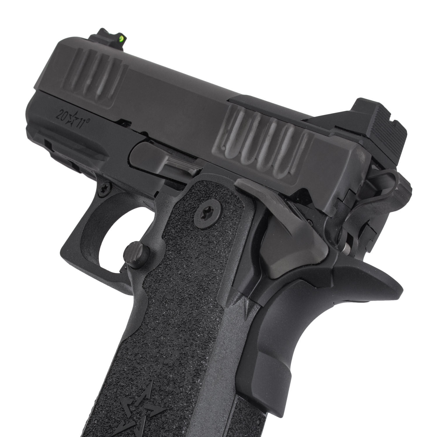 Serrations on the rear and front of the slide provide the user with a positive gripping surface when manipulating the slide. The aggressive concave cuts complement the classic design of the 2011.