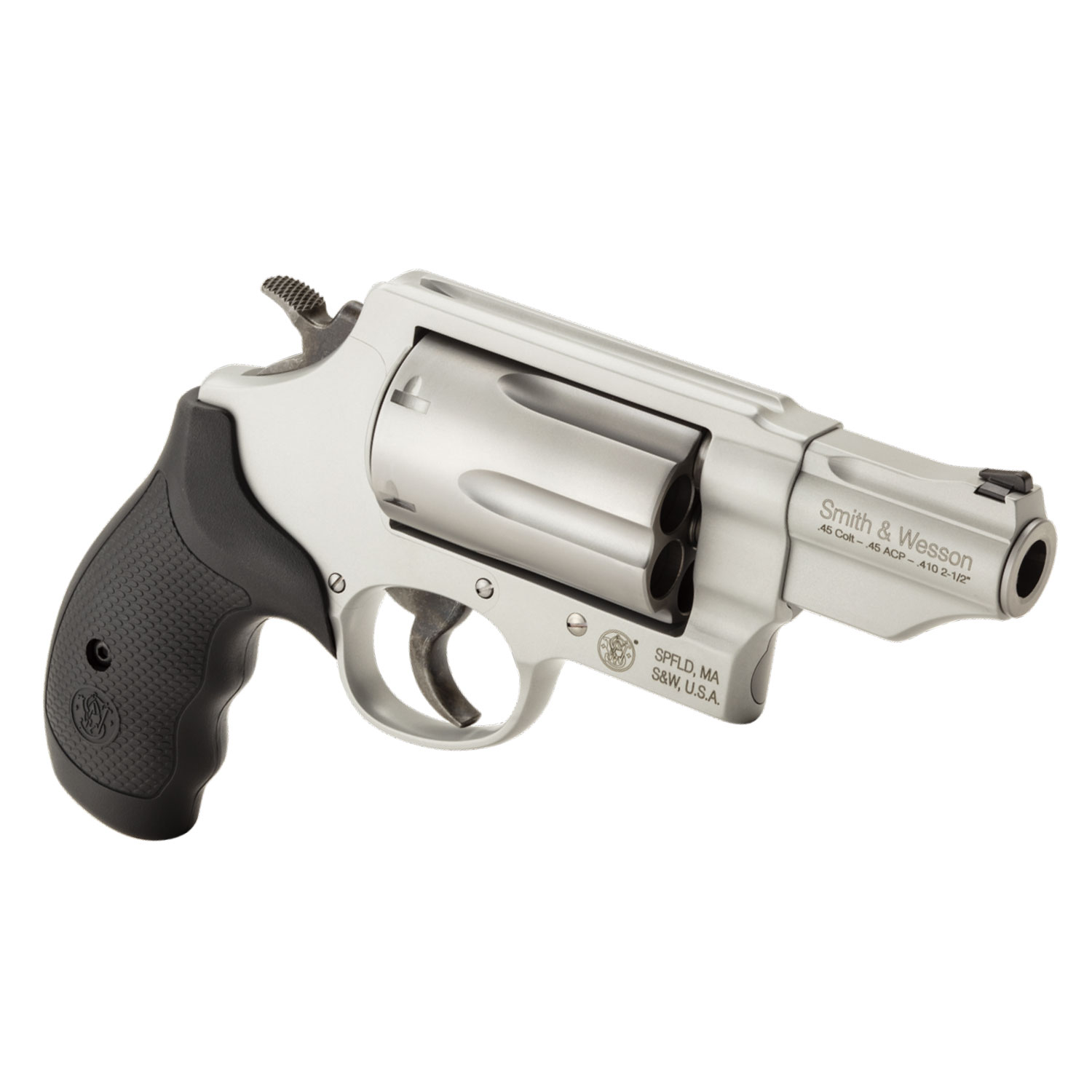 Description: Smith & Wesson Governor .45/.410-2.5", 2.75" Barrel 6-Shot, Stainless w/ Matte Silver Z-Frame. Manufactured from stainless steel with an aluminum alloy matte silver coated frame, this Smith & Wesson Governor Z-Frame revolver is a powerful choice as a defense firearm. The Governor is chambered for .45 ACP / .45 Colt and can also shot 2.5" .410 bore shells with a six round capacity cylinder. This revolver is loaded with various features including an internal lock to render the firearm inert when not in use. The Governor features a 2-3/4" barrel, an integral front sight, rear sight groove along the frame and a synthetic black grip. Easy to use, this revolver is designed to hit your target in every situation.