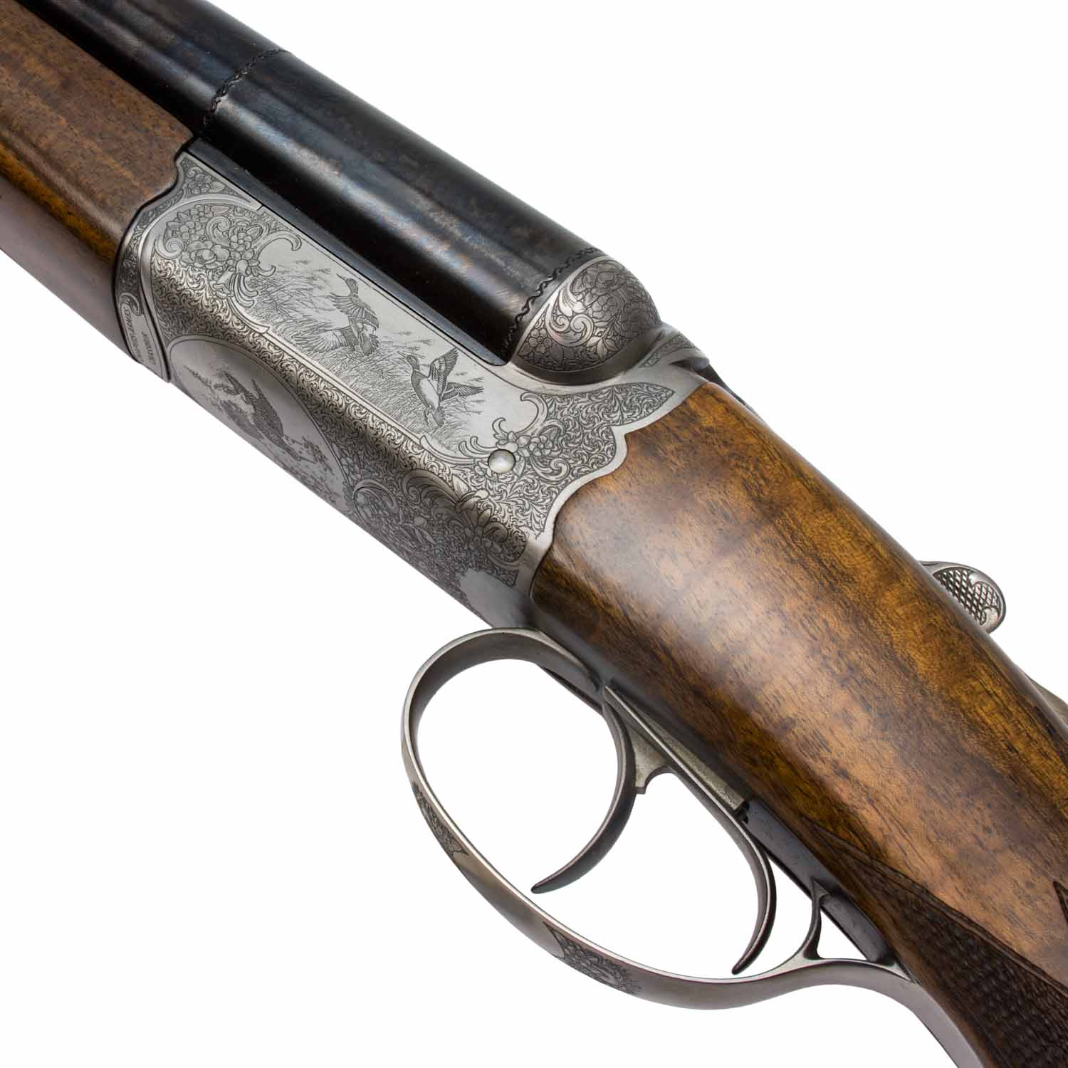 The Chasseur Classic Side-by-Side 12 gauge shotgun features beautiful laser engraving on it's receiver. The engraved upland game scenes are bordered by acanthus scrollwork. All of the metal portions of the receiver, trigger guard, selector, forend latch and safety features quality engravings.