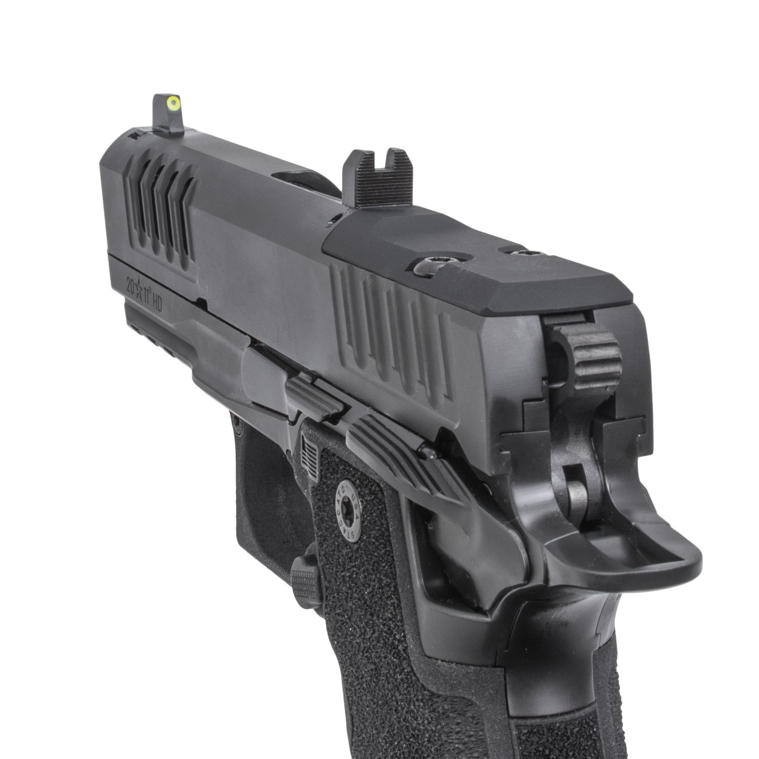The Staccato 2011 HD P4 has an ambidextrous safety lever, ambi slide lock, and a left-side magazine release which is reversible.