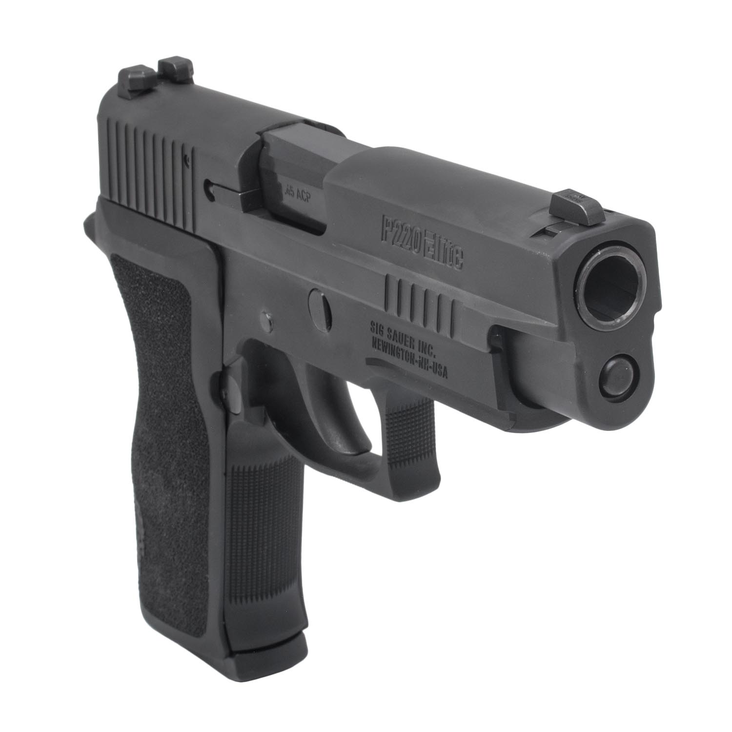 Description: Sig Sauer P220 Elite DA/SA Pistol, 45 ACP, (2) 8rd. Magazines. Designed by Sig Sauer and chambered in .45 ACP, the P220 Elite full-sized pistol ships with two single-stacked 8 round magazines. This P220 pistol features all-black controls against a black full size frame and a 4.4" carbon steel barrel. The slide has front and rear serrations with SIGLITE front / rear sights installed. A manual decocker is located on the left side of the pistol as it can be fired in either double action or single action modes. The P220 Elite is a quality piece of Sig Sauer hardware and reflects true Sig Sauer craftsmanship in every detail.