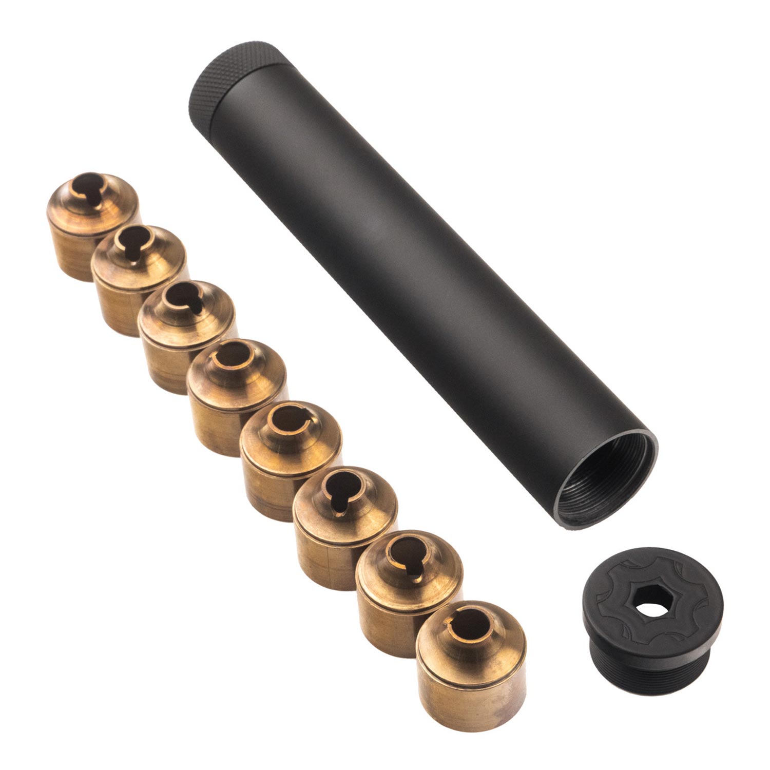 Weighing in at a mere 5.6oz the .22LR DEFCAN-22 brings superior sound suppression to your favorite rimfire cartridges. The scant weight and 1" diameter allow the DEFCAN-22 to be as at home on a handgun as it is on the end of a rifle. Removable end caps and baffles make user serviceability a cinch for cleanup while baffle indexing marks make for quick reassembly that assures you get optimal sound suppression once it's reassembled. A hex opening on the front cap allows a 1/4" allen wrench or hex bit to be inserted for easier disassembly in the event any carbon fouls up the threads.