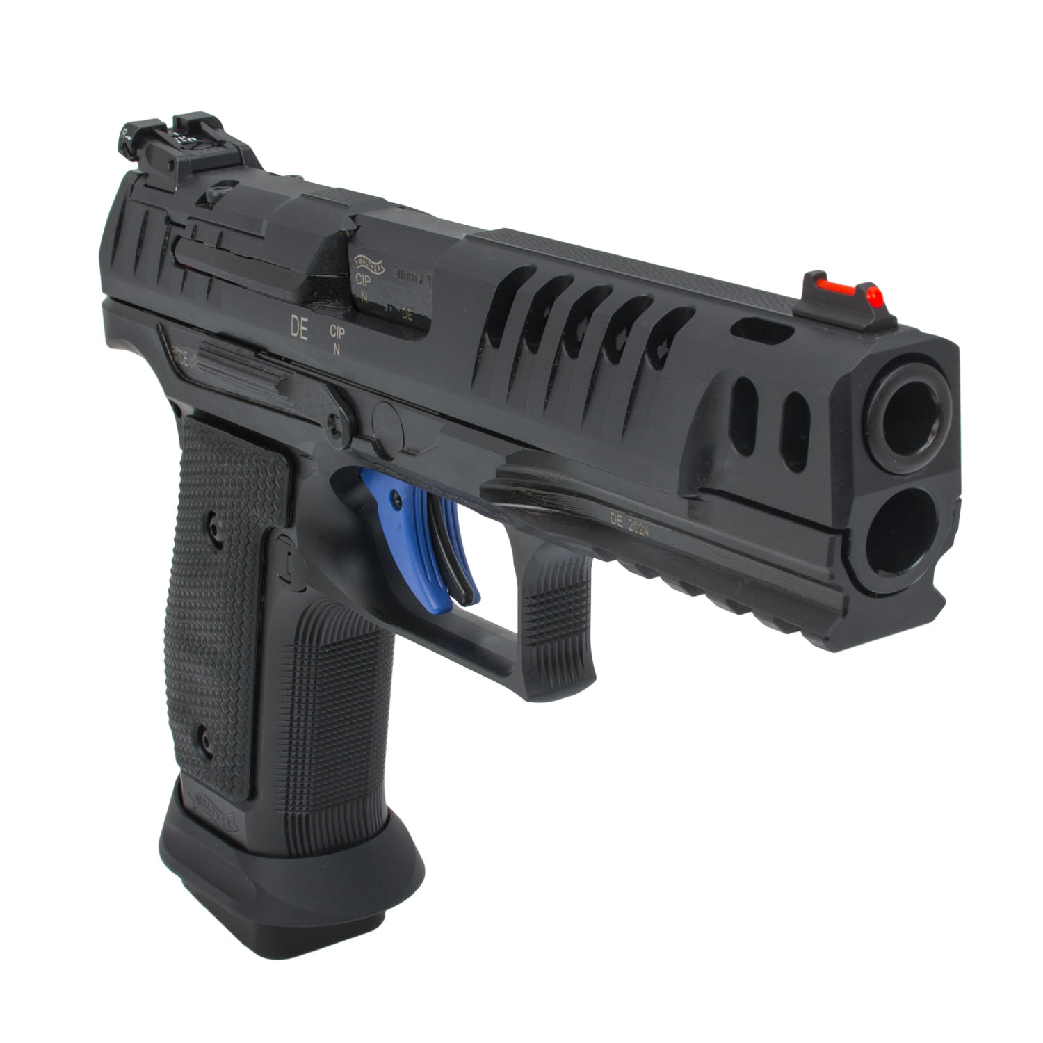 The Q5 Match Steel Frame is superior performance taken to the next level through heightened functionality and a relentless determination to deliver precisely what the experienced shooter demands. The Q5 Match Steel Frame is a testament to the level of excellence found solely at Walther. Its steel frame - precision machined from solid steel billet - improves ergonomics with a wrap-around grip panel, extended beavertail, full-length picatinny rail, and recessed slide release. The weight distribution of the steel frame drastically reduces recoil to improve shooter performance, ultimately contributing to overall efficiency. For added speed and capacity, the PRO model includes Carl Walther Performance magwell and +2 aluminum base plates.