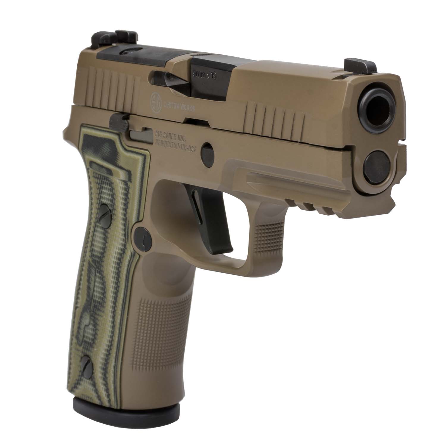 The Custom Works P320 AXG Scorpion features the newly developed AXG metal grip module, precision machined with deep undercuts and an extended beavertail for an ergonomic, comfortable fit and is fitted with signature Scorpion G10 grips from Hogue for complete control. Both the slide and frame are finished with a Cerakote Elite coating in FDE for extreme protection. It utilizes the advanced LEGION lightened, skeletonized, flat-bade trigger, and includes a SIG Pro Series removable optics plate with dovetail XRAY3 day/night rear sights and XRAY3 day/night front sight. It also comes with (3) advanced P320 magazines, featuring witness holes for each loaded round and a high-visibility follower.