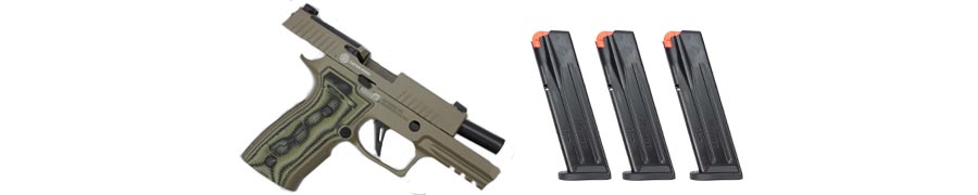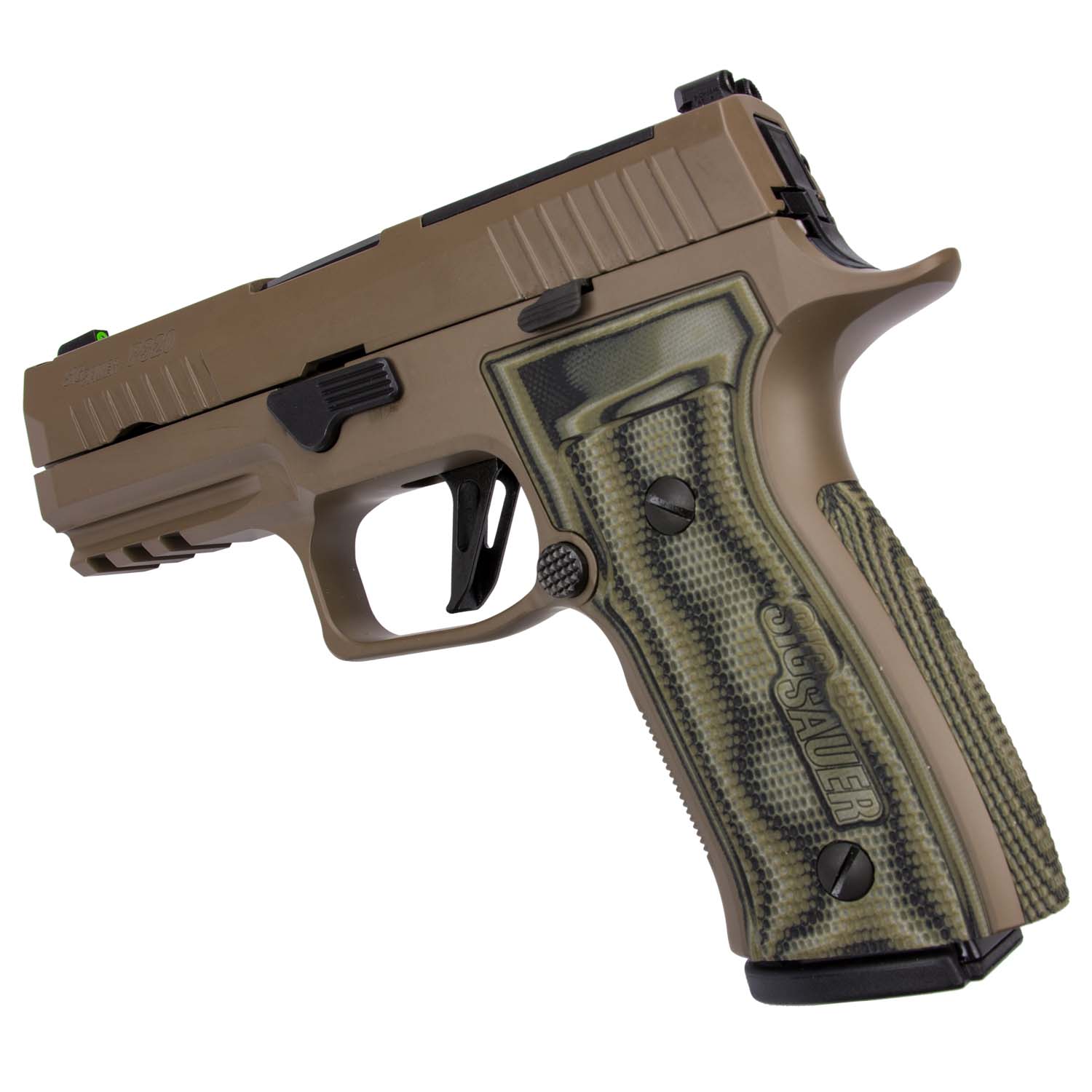Description: Sig Sauer Custom Works P320 AXG Scorpion Pistol, 9mm w/17 Round Mags. Crafted by the Sig Sauer Custom Works division, this limited edition P320 features a classic metal frame with flat dark earth Cerakote and G10 Scorpion Hogue grips. This Sig Sauer pistol is chambered in 9mm, has a 3.9" barrel and ships with three 17 round magazines. The slide features front / rear serrations, X-RAY3 day / night sights installed and the rear optics plate is made for SIG Pro Series line of pistol optics. The pistol has an ambidextrous slide release lever as well as a reversible magazine release.