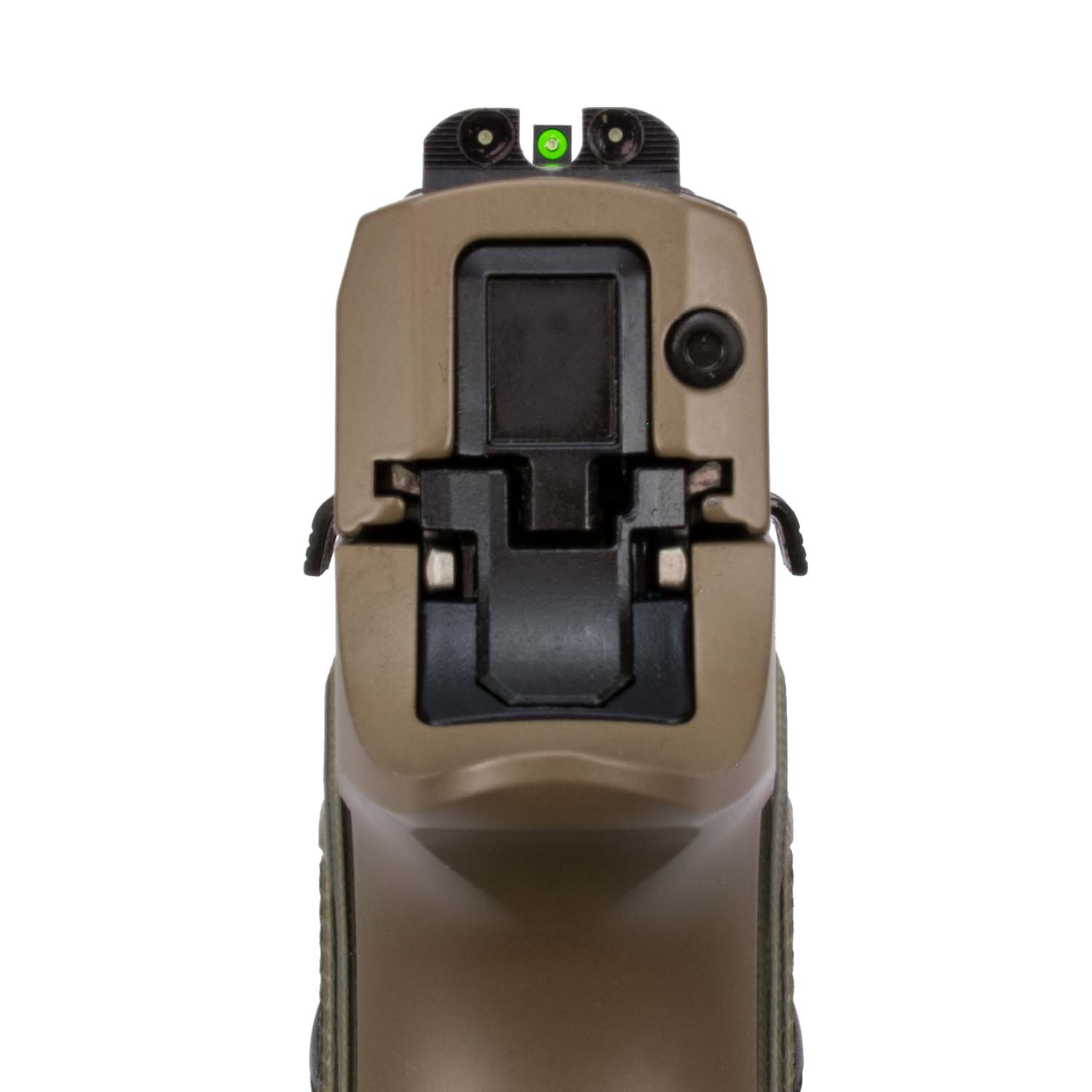 This pistol is designed with the AXG (Alloy XSeries Grip) metal grip module as a foundation. Both the frame and slide are Cerakote finished in flat dark earth.