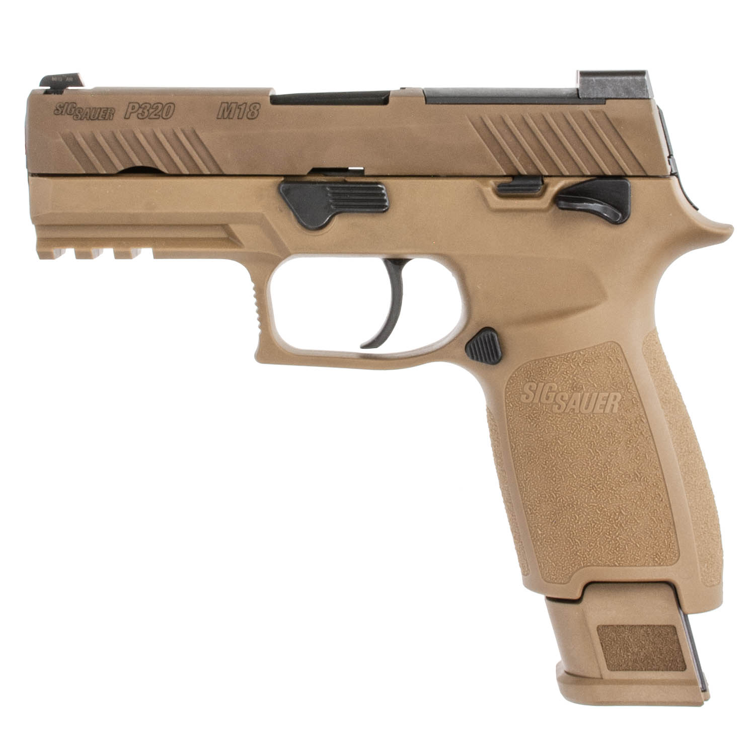 Description: Sig Sauer P320 M18 Pistol, 9mm, (1) 17 Round Mag, (1) 21 Round Mags, Coyote Brown. The M18 pistol was recently issued to all branches of the U.S. Military and was chosen as the official firearm of the U.S. Marine Corps. This P320 M18 is the civilian version and brings the same unprecedented accuracy, reliability and durability that the military demands. Chambered in 9mm and with a Coyote Tan finish, this Sig Sauer pistol comes with one 17 round magazine and one 21 round magazines. Each P320 M18 pistol comes with a manual safety, black controls, LCI (Loaded Chamber Indicator), SIGLITE night sights and a removable rear night sight plate for optic installation and is directly compatible with the Sig Sauer ROMEO1 PRO optic.