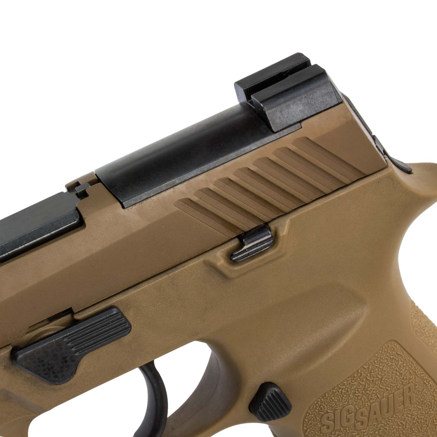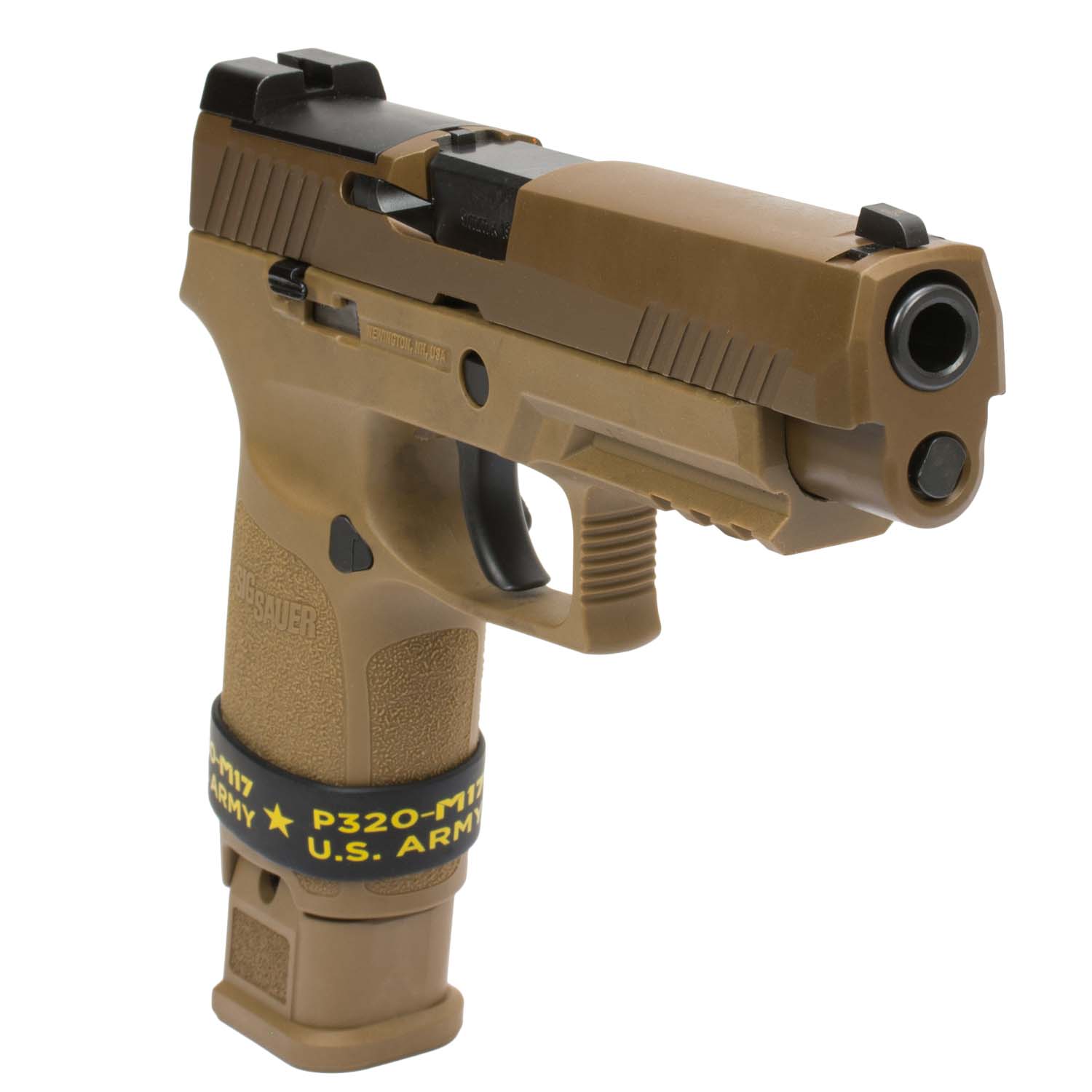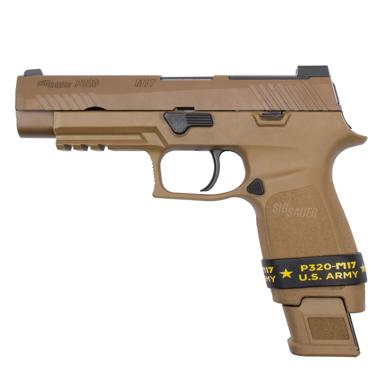 The P320-M17 is a 9mm, striker-fired pistol and comes with one (1) 17-round magazine and two (2) 21-round magazines. The pistol features a coyote-tan PVD coated stainless steel slide with the same optic cut as specified by the MHS contract, and black controls just like the pistols currently being shipped to the U.S. Army; it comes equipped with a SIGLITE front night sight and removable Night Sight rear plate. The P320-M17 features a coyote-tan carry-length grip module and a full size frame.
