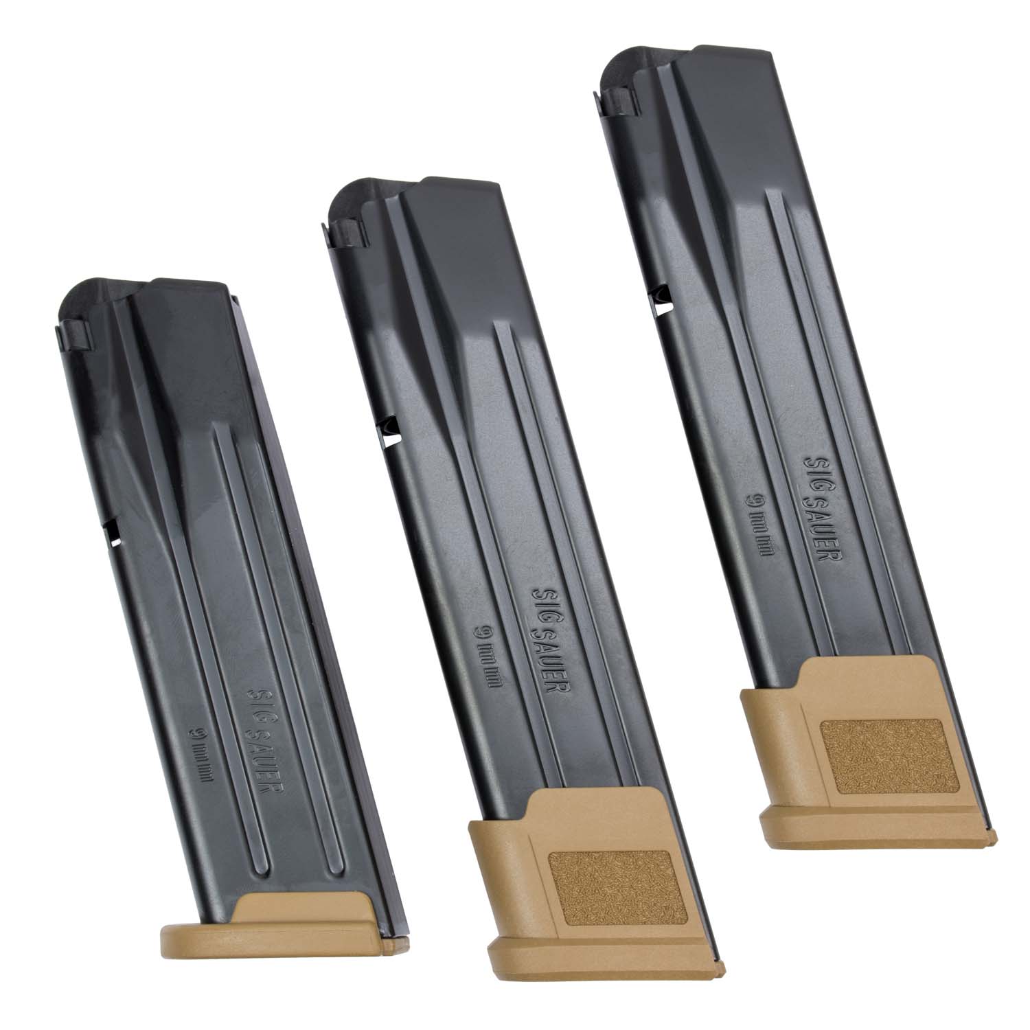 This pistol ships with two (2) 21 round extended magazines and one (1) 17 round magazine chambered for 9mm. These mags are constructed of a matte black steel and feature indicator holes to keep track of number of rounds loaded.
