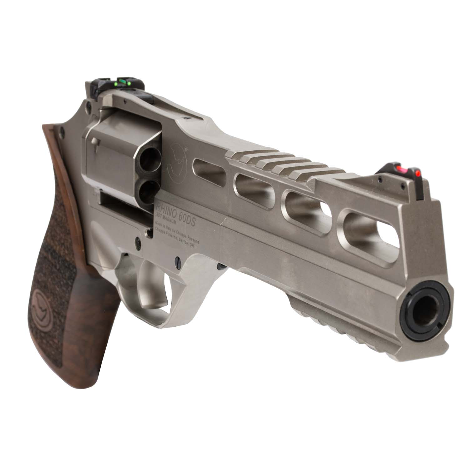 Description: Chiappa Rhino Revolver 60DS, Nickel, 6" Barrel. Featuring an attractive nickel plated design and crafted to reliably deliver rounds downrange, the Rhino 60DS revolver from Chiappa is the ideal blend of power, style and function. This Rhino model features a 6" barrel with a an alloy frame and a 6 shot steel cylinder chambered for .357 Magnum - all nickel plated. The pistol has walnut grips, fiber optic front / rear sights, a top rail and an under-the-barrel Picatinny rail. The Chiappa Rhino's barrel is indexed at the bottom of the cylinder to assist in recoil mitigation to keep you on target for easier follow-up shots. Grab this eye-catching revolver today to expand any firearm collection.