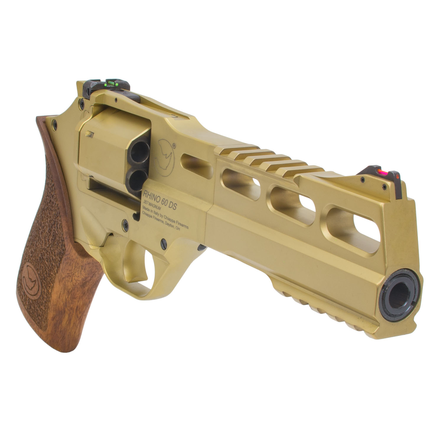 Description: Chiappa Rhino Revolver 60DS, Gold PVD, 6" Barrel 357Mag. Featuring an eye-catching gold PVD design and crafted to reliably deliver rounds downrange, the Rhino 60DS revolver from Chiappa is the perfect blend of power, style and function. This Rhino model features a 6" barrel with a a 7075-T6 alloy frame and a 6 shot steel cylinder chambered for .357 Magnum - all gold PVD. The pistol has walnut grips, fiber optic front / rear sights, a top rail and an under-the-barrel Picatinny rail. The Chiappa Rhino's barrel is indexed at the bottom of the cylinder to assist in recoil mitigation to keep you on target for easier follow-up shots. Grab this unique revolver today to expand any firearm collection.