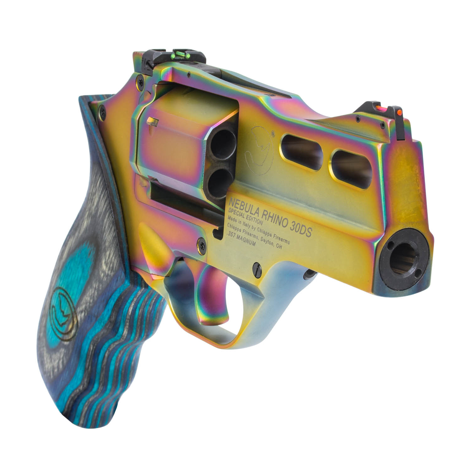 Description: Chiappa Rhino Nebula Revolver 30DS, 3" Barrel 357 Mag. Uniquely designed with a multi-color PVD finish and crafted for reliability, the Rhino 30DS revolver from Chiappa is the perfect blend of function, power and style. This Rhino model features a 3" barrel with a 6 shot steel cylinder chambered for .357 Magnum. The Nebula pistol has a laminate grip with blue/gray coloring, fiber optic front sight and an adjustable rear fiber optic sight. A premium leather holster and deluxe gun case comes with this model. The Chiappa Rhino's barrel is indexed at the bottom of the cylinder to assist in recoil mitigation to keep you on target for easier follow-up shots. Grab this eye-catching revolver today to expand any firearm collection.