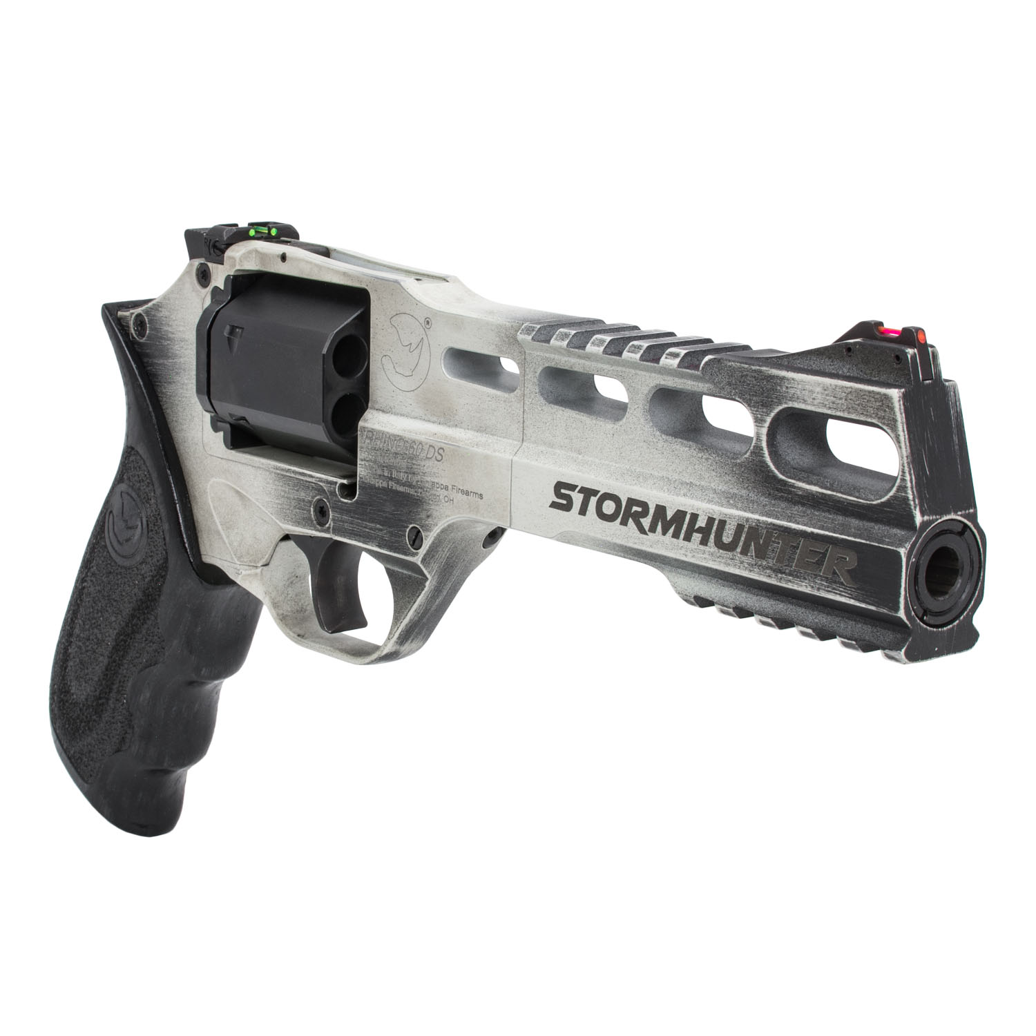 Description: Chiappa Rhino StormHunter Revolver 60DS, 6" Barrel 357 Mag. Featuring an attention-grabbing StormHunter black/white finish and crafted to reliably deliver rounds downrange, the Rhino 60DS revolver from Chiappa is the ideal blend of power, style and function. This Rhino model features a 6" barrel with a an alloy frame and a black 6 shot steel cylinder chambered for .357 Magnum. The pistol has stippled walnut black grips, fiber optic front / rear sights, a top rail and an under-the-barrel Picatinny rail. The Chiappa Rhino's barrel is indexed at the bottom of the cylinder to assist in recoil mitigation to keep you on target for easier follow-up shots. Grab this eye-catching revolver today to expand any firearm collection.