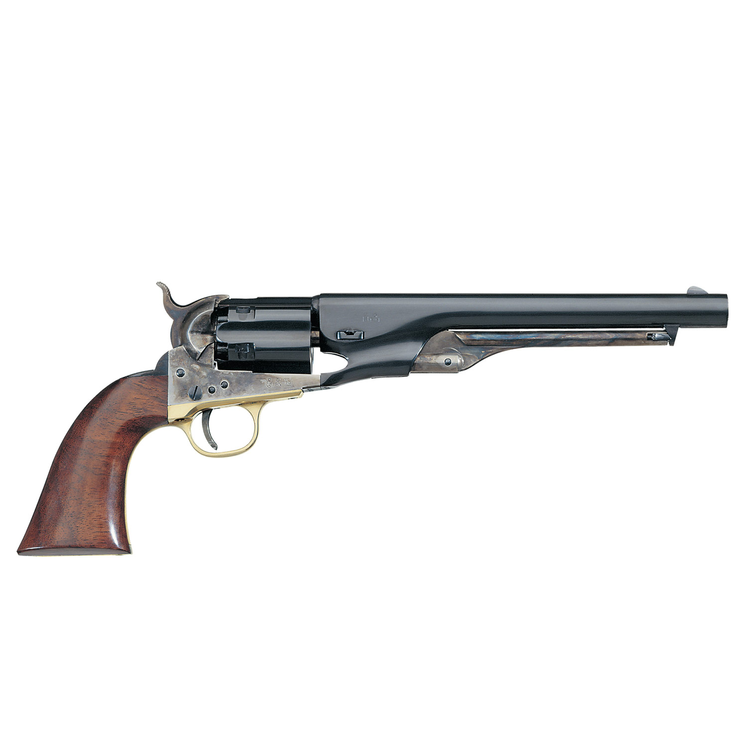 Description: Uberti 1860 Army Fluted Steel Black Powder Revolver, .44cal., 8" Barrel. Designed after the initial version of the model, this Uberti 1860 Army black powder revolver features the fluted cylinder of the iconic shooter developed by Samuel Colt. An 8 inch barrel is featured on this muzzleloader and is chambered for .44 caliber projectiles. This 6-shot single action revolver has a color case hardened steel frame with a gloss-blued cylinder/backstrap and a brass trigger guard. The pistol has a set of smooth walnut grips and a front sight blade that pairs with a hammer-integrated rear sight. Grab this eye-catching revolver today to expand your classic replica firearm collection with a Uberti 1860 Army.