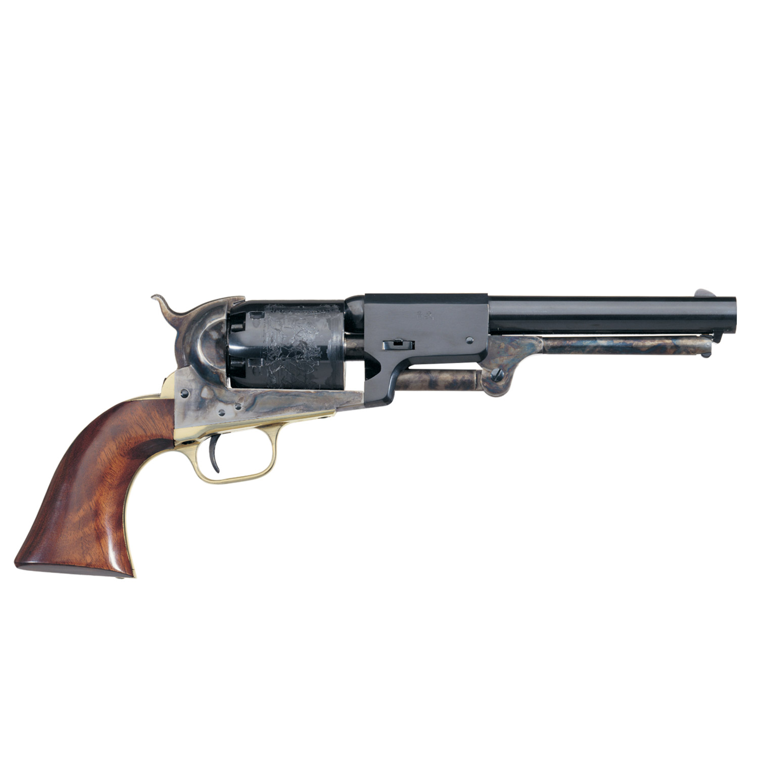 Description: Uberti 1848 Dragoon 3rd Model Black Powder Revolver, .44cal., 7.5" Barrel. Improving upon the classics, the Uberti 1848 Dragoon black powder revolver features modern reliability with the traditional 3rd Model form of the legendary Dragoon. A 7.5 inch barrel is featured on this muzzleloader and is chambered for .44 caliber projectiles. This 6-shot single action revolver has a color case hardened steel frame with gloss blued cylinder along with a brass backstrap and rounded trigger guard. The pistol has a set of smooth walnut grips. The rear sight of this 1848 Dragoon is a top-of-the-frame groove that lines up with the front sight blade. Grab this eye-catching revolver today to expand your classic replica firearm collection.