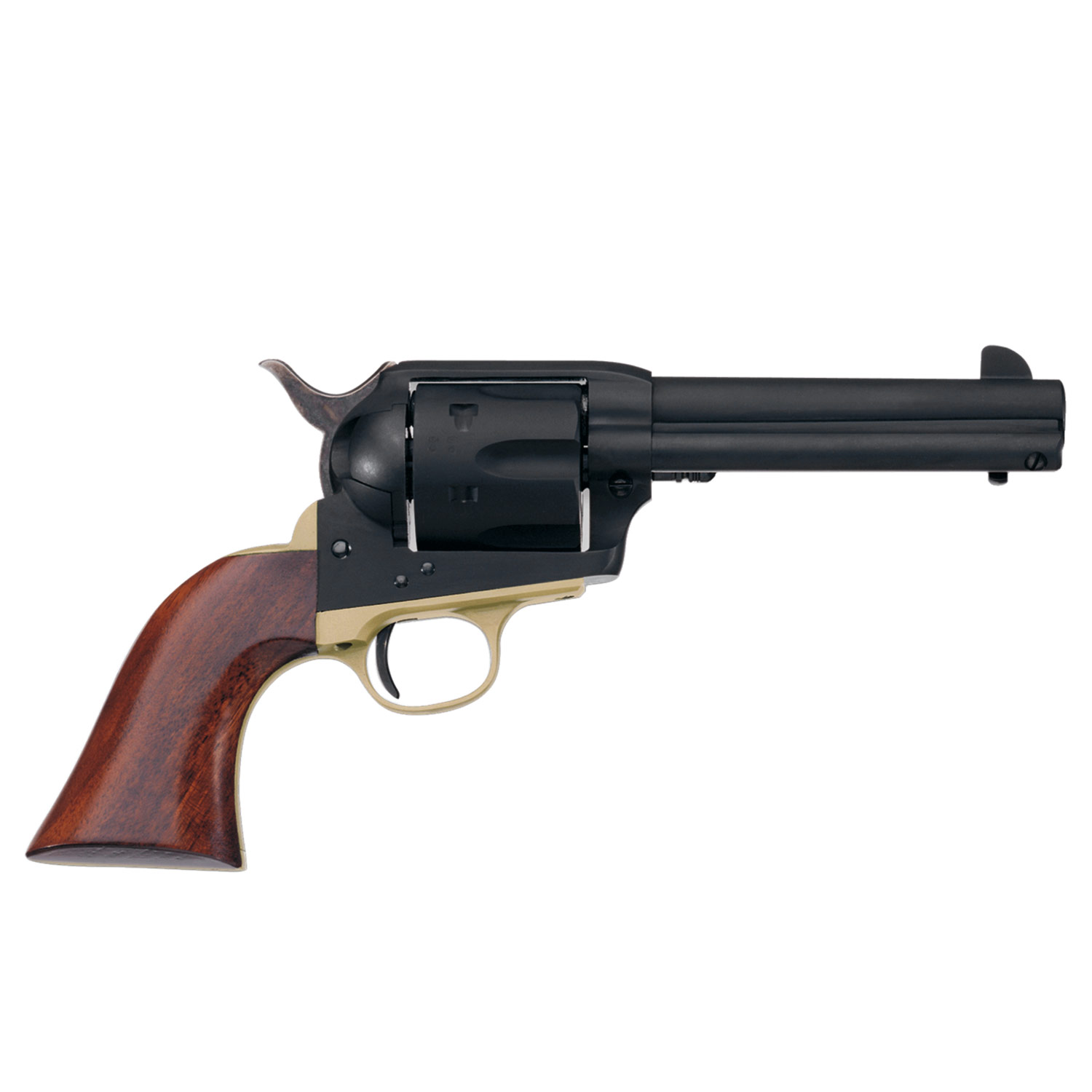 Description: Uberti 1873 Cattleman Hombre Revolver, 357 Mag, 4.75" Barrel. The Uberti Cattleman Hombre revolver features modern design updates to the classic 1873 revolver of old. The barrel of this 6-shooter measures 4.75 inches and is chambered for .357 Magnum. This single action revolver has a matte black steel frame with cylinder, barrel and trigger while the hammer is case color and the trigger guard / backstrap is a matte brass. The pistol has a set of walnut grips with a top-of-the-frame groove rear sight that lines up with the front sight blade. Grab this eye-catching revolver today to expand your classic replica firearm collection.
