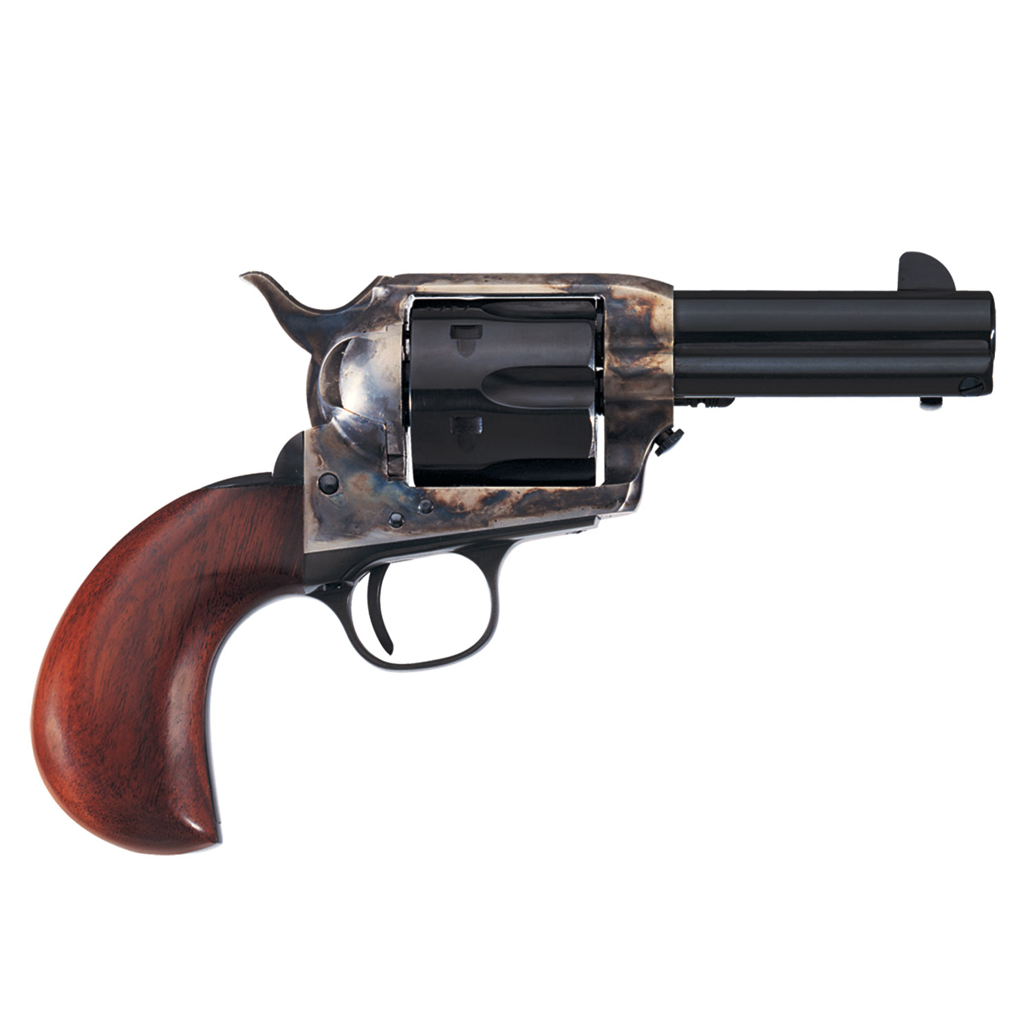 Description: Uberti 1873 Cattleman Birds Head Revolver, 45 Colt, 3.5" Barrel. Improving upon the classics, the Uberti Cattleman Bird's Head old model revolver features modern design updates, a 3.5 inch barrel and is chambered for .45 Colt. This 6-shot single action revolver has a color case hardened steel frame with gloss blued cylinder, trigger guard and backstrap. The pistol has a set of smooth Bird's Head walnut grips. The rear sight of this 1873 Cattleman is a top-of-the-frame groove that lines up with the front sight blade. Grab this eye-catching revolver today to expand your classic replica firearm collection.