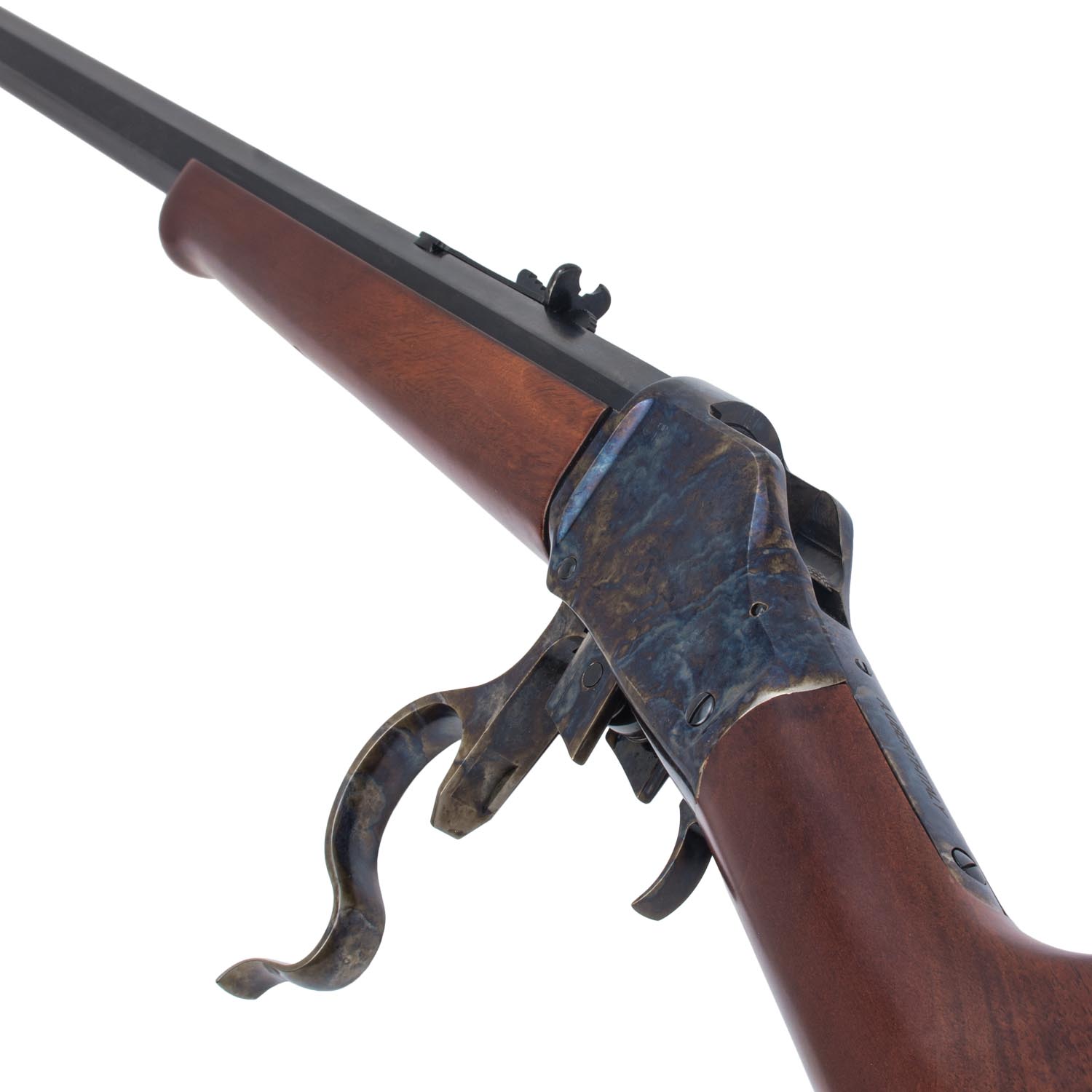 Description: Uberti 1885 High Wall Single Shot Sporting Rifle, .45/70 Govt., 30" Barrel. Based on the iconic firearm preferred at shooting exhibitions and marksmanship contests during its, this 1885 High Wall rifle from Uberti is designed to reflect the popular period model that was renowned for both accuracy and ruggedness. Chambered in .45-70 Government, this single-shot lever-action rifle features a color case hardened receiver/frame with a blued buttplate affixed to the walnut buttstock. The stock houses a breakdown cleaning rod to ensure a clean rifle no matter where you are. The 1885 High Wall Sporting boasts a 30" octagon barrel, front sight blade, adjustable dovetail rear sight and can accept Creedmoor-style sights for improved accuracy. Expand your firearms arsenal with this iconic rifle and trust the high-quality craftsmanship from Uberti.