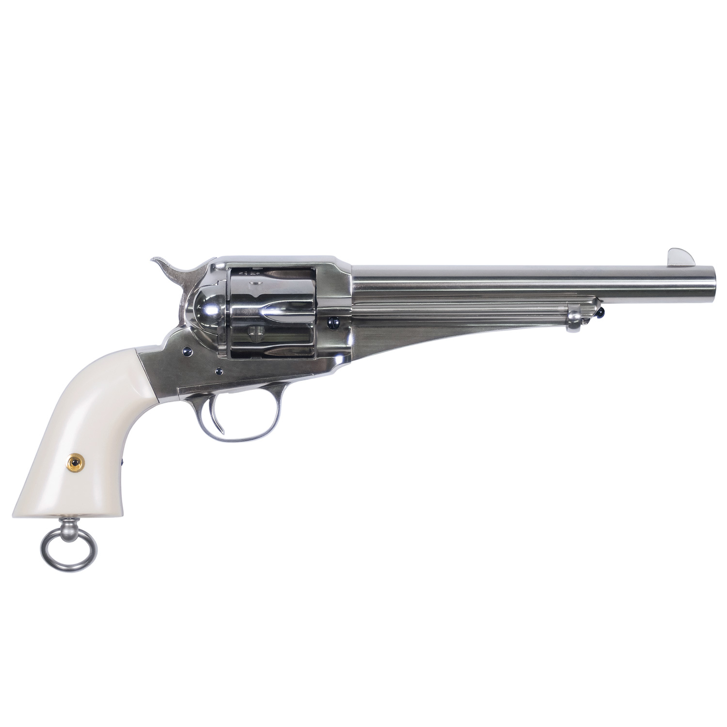 This is a near exact replica of the 1875 Remington carried by famous outlaw Frank James, brother to Jesse James. The original, which was surrendered to Governor Crittenden in 1882, now resides in the Autry museum in California. Frank comes in full nickel plated steel with an ivory-style grip.