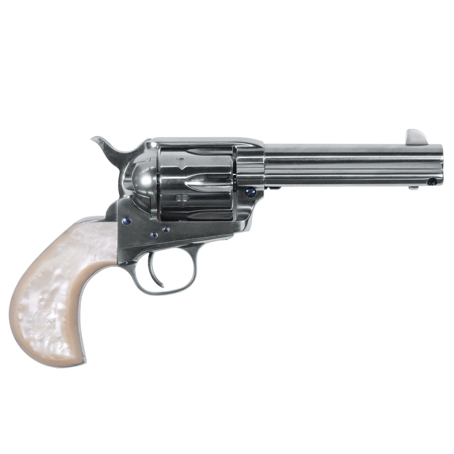 Doc Holliday is one of the most beloved dandy-gamblers in American lore, who often doubled as a lawman on the side of his friend Wyatt Earp. This revolver follows the lines of Doc's Lightning revolver, but is available in the more reliable 1873 action and the powerful .45 Colt cartridge. Doc has a full nickel plated steel finish with a pearl-style grip.