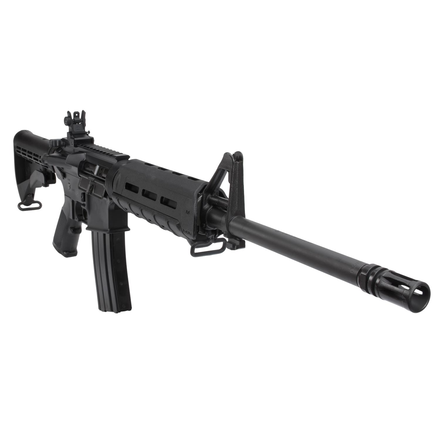 This carbine is equipped with a Magpul MOE handguard featuring M-LOK attachment points on all sides.
