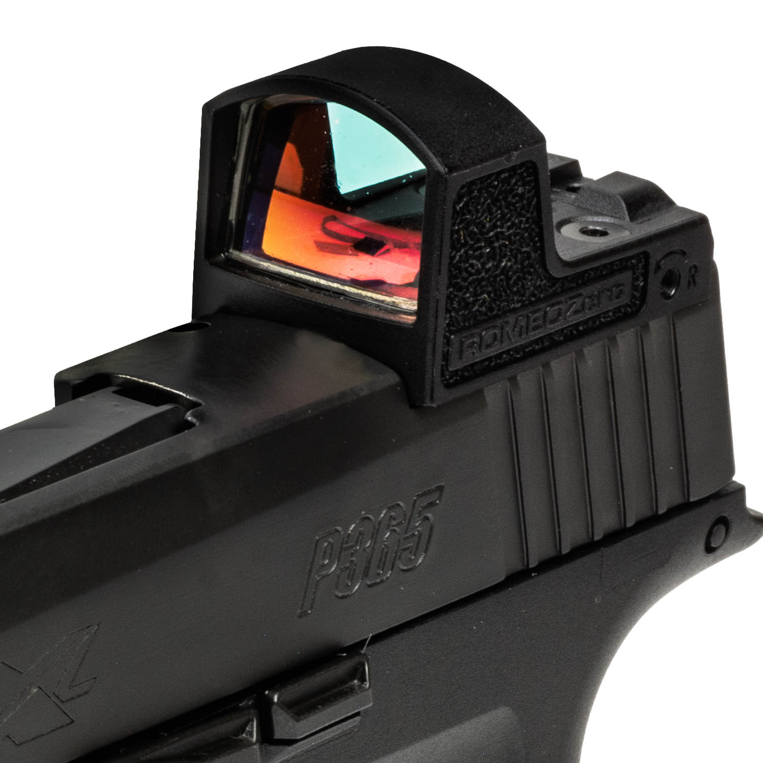 This P365XL comes with the pre-installed Romeo Zero. This optimized sight is loaded with features, including a SpectraCoat HD polymer lens with an objective lens diameter of 24mm, WeaponsGrade Ultralite polymer housing, integrated stippling pattern, and 8 vivid and user configurable daytime illumination levels.