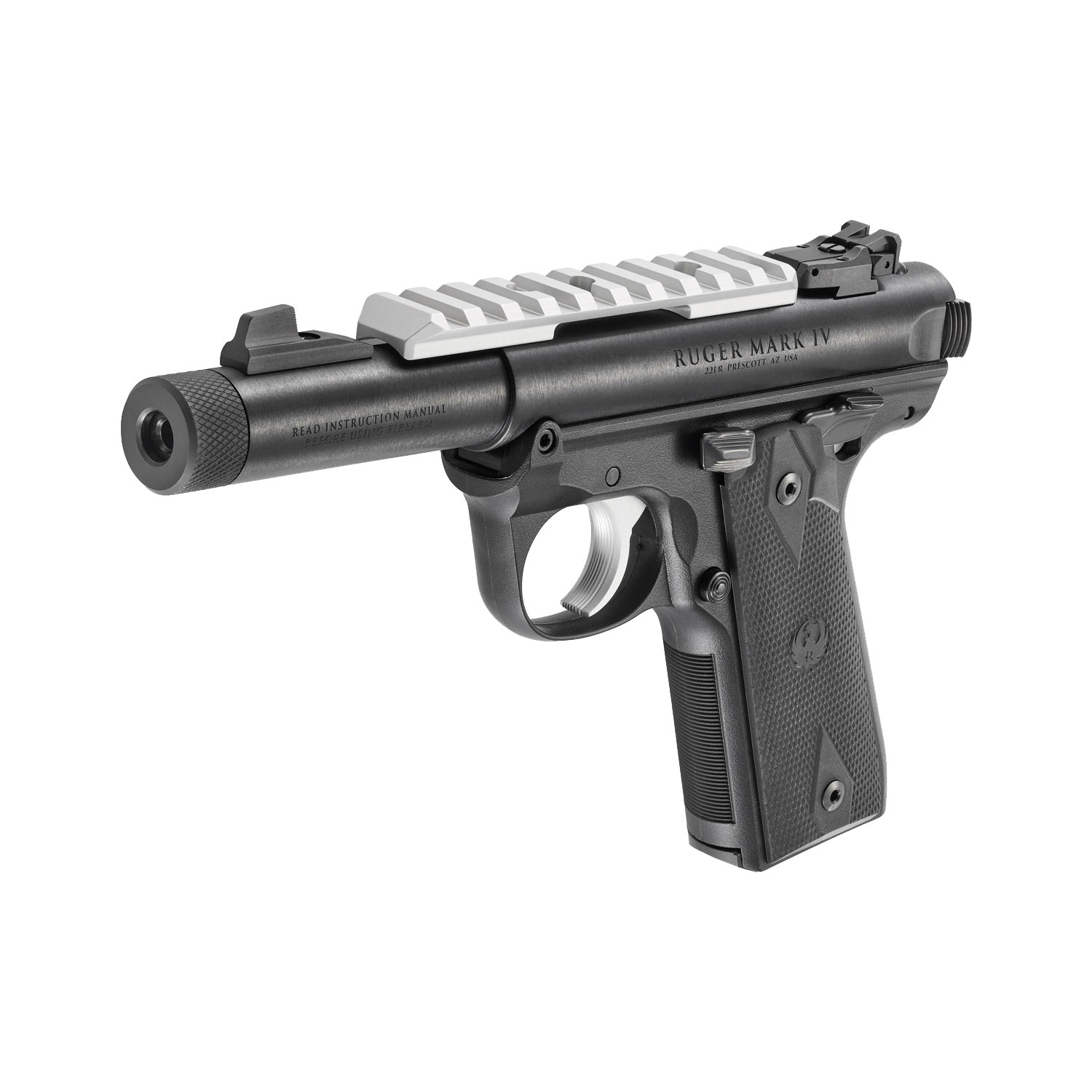 Description: Ruger Mark IV 22/45 .22 LR 4.4" Barrel, Threaded 1/2"-28. Crafted for performance with a match-grade design, the Ruger Mark IV 22/45 pistol is chambered in .22 LR and delivers the rock-solid performance sought after by avid plinkers and competition shooters alike. This version of the Mark IV 22/45 features a black, cold hammer-forged barrel and checkered, 1911-style grip panels. Two 10-round magazines are included with the pistol, and it comes equipped with a black blade front sight and an elevation/windage adjustable rear sight.