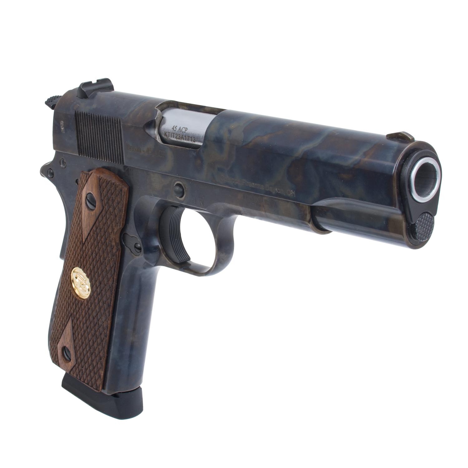 Description: Charles Daly 1911 Field Pistol, Case Color, 45ACP. This 1911 Field model from Charles Daly is chambered in .45 ACP and includes an 8 round single stacked magazine. The steel frame of this pistol features a color case hardened finish and the grips installed are made from walnut with diamond checkering and a gold "CD" medallion. A manual safety for this single action only (SAO) pistol is located on the left side of the frame. The 5" steel barrel of this full sized pistol gives you all of the classic power and accuracy of the traditional 1911 platform.