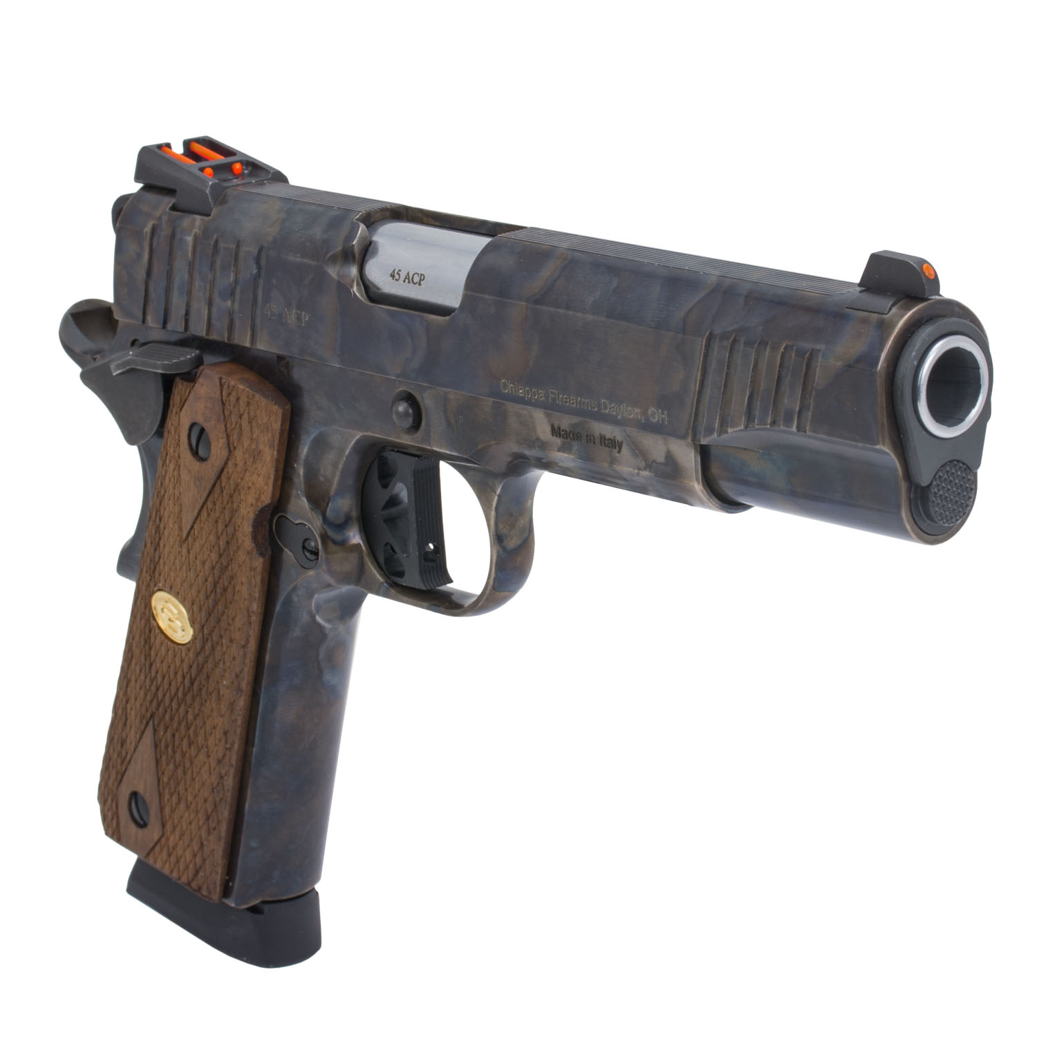 Description: Charles Daly 1911 Superior Grade Pistol, Case Color, 45ACP. This 1911 Superior-Grade model from Charles Daly is chambered in .45 ACP and includes two 8 round single stacked magazines. The steel frame of this pistol features a color case hardened finish and the grips installed are made from walnut with diamond checkering and a gold "CD" medallion. An ambidextrous manual safety for this single action only (SAO) pistol is installed to the frame. The 5" steel barrel of this full sized pistol gives you all of the classic power and accuracy of the traditional 1911 platform. The slide has aggressive serrations at the front/rear, the trigger has skeletonized cuts and a red fiber optic sight set is installed.
