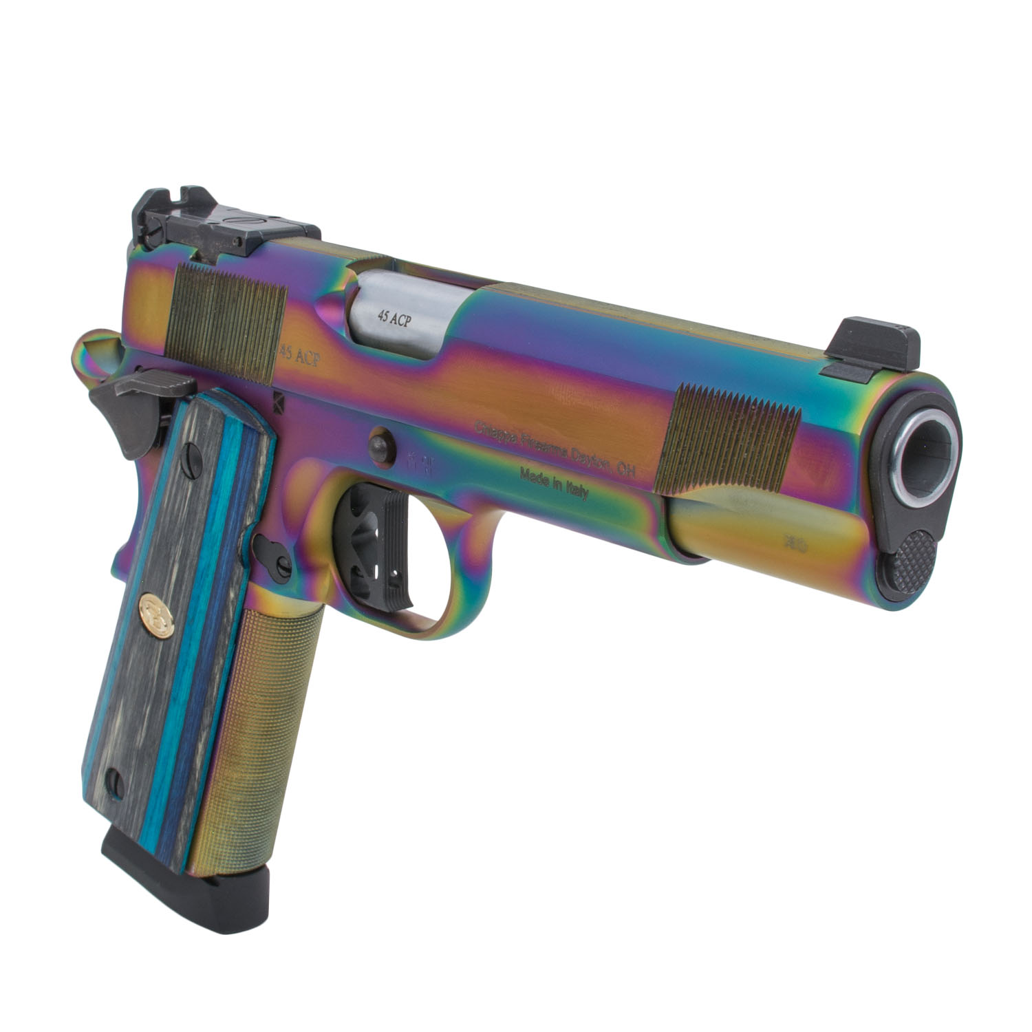 Description: Charles Daly 1911 Empire Grade Pistol, Nebula, 45ACP. This 1911 Empire Grade model from Charles Daly is chambered in .45 ACP and includes two 8 round single stacked magazines. The steel frame of this pistol features a multi-colored Nebula finish and the grips installed are made from blue laminate material with a gold "CD" medallion. The manual safety for this single action only (SAO) pistol is ambidextrous and the controls, sights and trigger carry a black finish. The 5" steel barrel of this full sized pistol gives you all of the classic power and accuracy of the traditional 1911 platform.