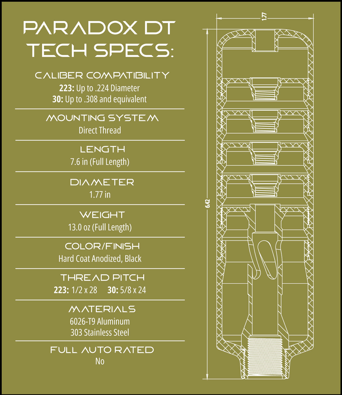 Description: Sonicore Suppressors Paradox DT, .223/5.56mm 1/2-28 Thread. The Paradox DT is a direct thread suppressor, with a lightweight and modular design machined from 6026-T9 Aluminum and 303 Stainless Steel, finished with black, non-glare, Mil Spec Hard Coat Anodize. The modular design allows the user to shorten the can when maneuverability ranks higher than suppression. The Paradox's lightweight design is achieved through using lightweight aluminum baffle modules in combination with 303 stainless steel baffle inserts to create a steel "core." An integrated stainless steel muzzle brake spins gas in a way to continuously tighten the suppressor onto your muzzle. The Paradox is a perfect lightweight and effective option for hunters.