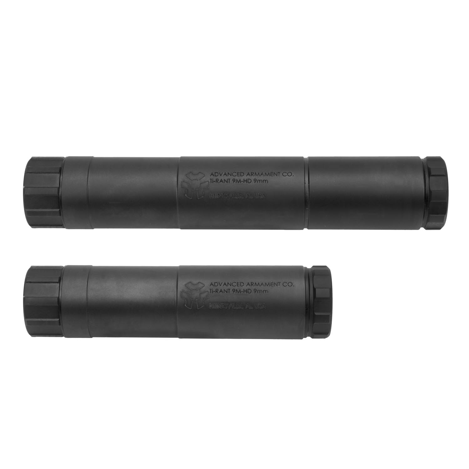 Description: AAC Ti-Rant 9M-HD 9mm Suppressor. The Ti-Rant suppressor series from Advanced Armament Company (AAC) is the versatile easy-to-use can interface for pistol caliber suppression. The 9mm suppressor is constructed from both titanium and 17-4PH T6 stainless steel with a black PVD finish. The Ti-Rant 9M-HD, which is the new version of the legacy Ti-Rant 9/9S, accepts Ti-Rant HD pistons for your firearm (sold separately). This suppressor fits pistols or carbines chambered in calibers up to 9mm including .385 Mag, .38 Special, .22 LR, .300 Blackout and even .350 Legend (for hunting). The suppressor's length can easily be reduced from 7.8" (11.3oz.) to 5.4" (9.2oz.) to fit your suppression / loadout needs. The 1.4" diameter Ti-Rant can reduce the sound by around 32 decibels - Remington UNC 9mm in an S&W M&P 9mm.
