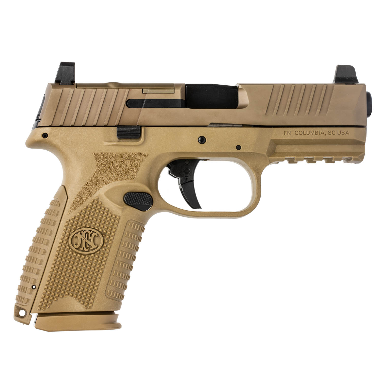 Description: FN 509 Midsize MRD, NMS FDE/FDE, (2) 15rd. Mags. Packing a full-size punch into a more concealable midsize form, this FN 509 Midsize NMS pistol is chambered in 9mm, comes with the miniature red dot (MRD) sight plate system and is perfect for commercial, law enforcement and military users alike. This pistol comes with 2 15 round magazines and features a fixed 3 dot luminescent sight system, a cold hammer-forged stainless steel barrel, polished chamber and feed ramp, a Flat Dark Earth coated slide with improved front and rear cocking serrations, MIL-STD-1913 accessory mounting rail, and more. Included with the FN 509 Midsize NMS pistol are two interchangeable backstraps, two 15-round magazines, a complete MRD optic mount kit, owner's manual, locking device, and an FN logo soft pistol case.