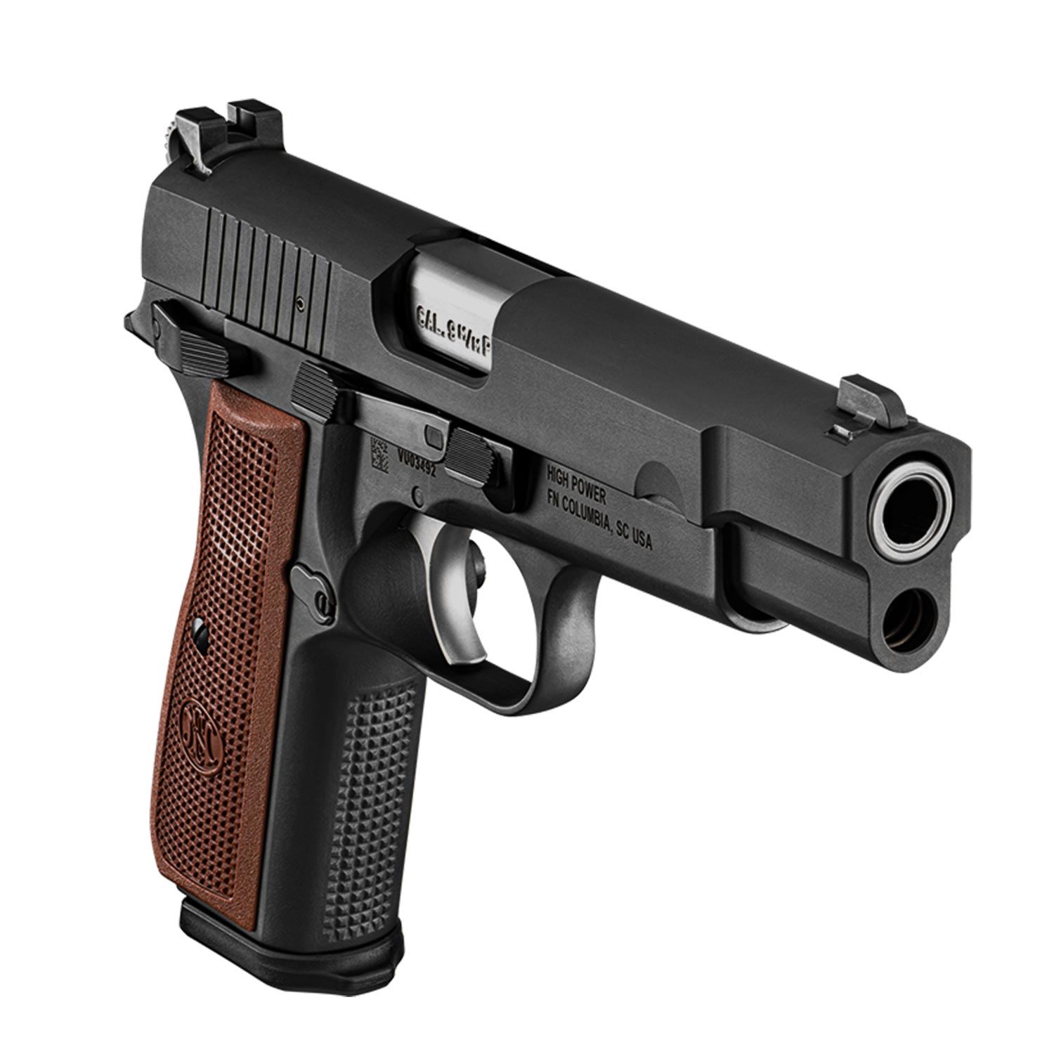 At 40-oz., the robust design keeps the signature rake of the dust cover and long arm slide release, adding ambi-controls for instinctive operation. An extended beavertail and raised hammer fit perfectly in hand. The FN High Power takes down instantly for maintenance, deletes the magazine disconnect, and ensures that most modern factory loads feed smoothly over the polished ramp of the cold hammer forged barrel.
