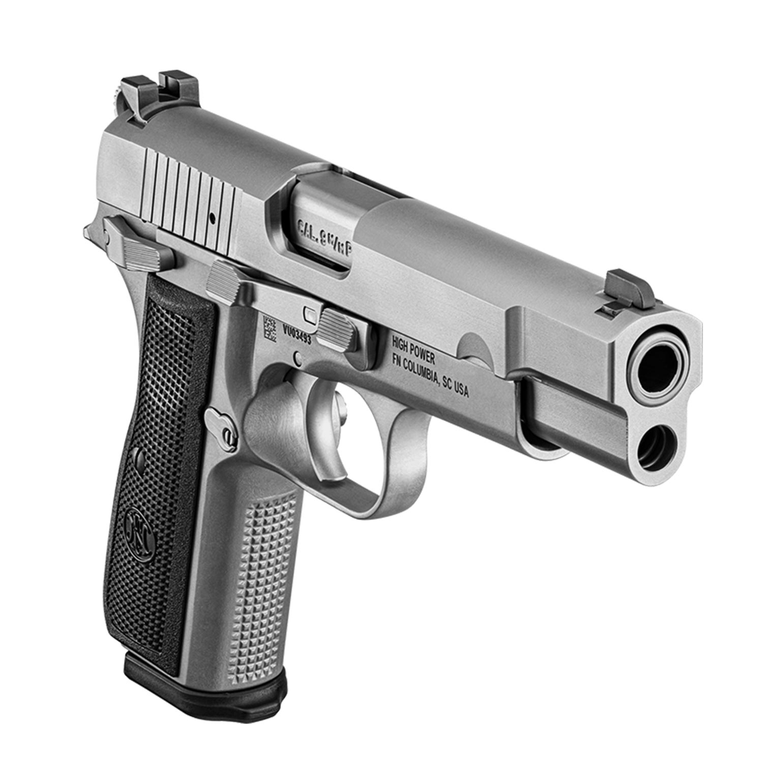 At 40-oz., the robust design keeps the signature rake of the dust cover and long arm slide release, adding ambi-controls for instinctive operation. An extended beavertail and raised hammer fit perfectly in hand. The FN High Power takes down instantly for maintenance, deletes the magazine disconnect, and ensures that most modern factory loads feed smoothly over the polished ramp of the cold hammer forged barrel.