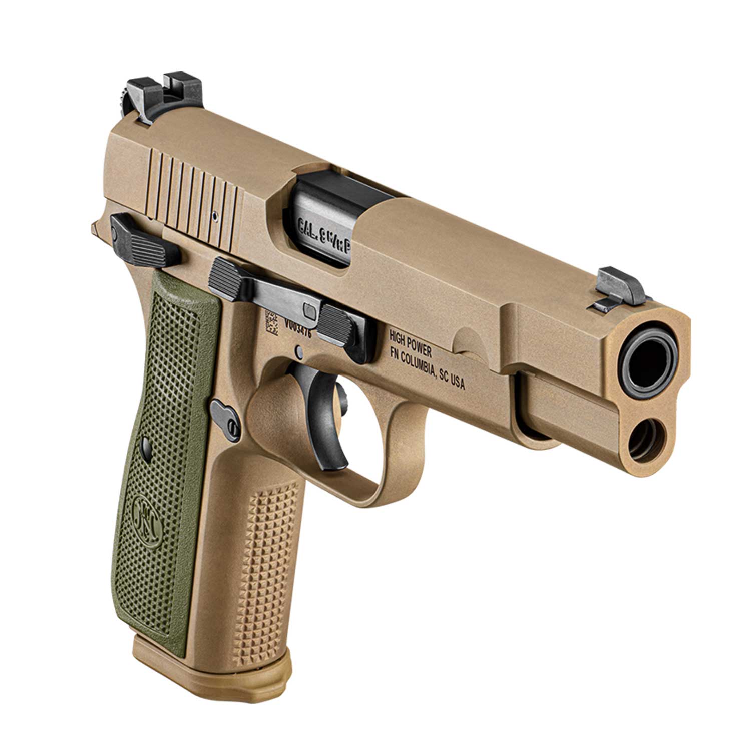 At 40-oz., the robust design keeps the signature rake of the dust cover and long arm slide release, adding ambi-controls for instinctive operation. An extended beavertail and raised hammer fit perfectly in hand. The FN High Power takes down instantly for maintenance, deletes the magazine disconnect, and ensures that most modern factory loads feed smoothly over the polished ramp of the cold hammer forged barrel.