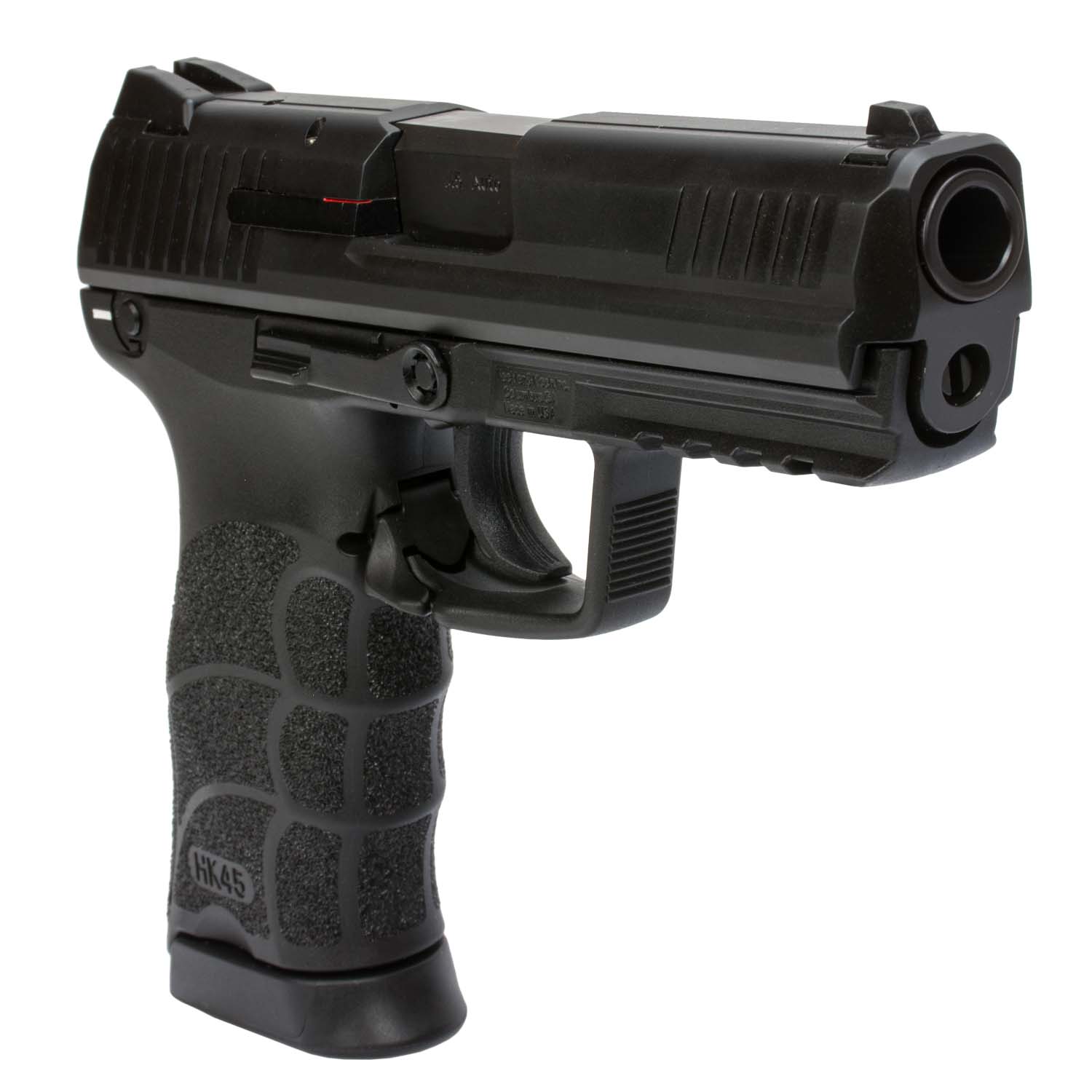 Description: Heckler & Koch HK45 Compact (V1) DA/SA, Two 8rd Magazines. This compact HK45 pistol from Heckler & Koch is chambered in .45 ACP and features an outstanding design to give the shooter great control when in service. The pistol is configured to be shot in either single or double action. The HK 45 Compact ships with two (2) 8 round zipper-backed magazines, has 3 dot light luminescent adjustable drift sights installed, ambidextrous mag release / slide stop and a left-side safety that also functions as a decocker. The safety can be reversed to the other side. The pistol has a universal groove system built into the frame to accept your favorite light or laser and the frame also boasts advanced grip texturing to ensure maximum control when shooting.