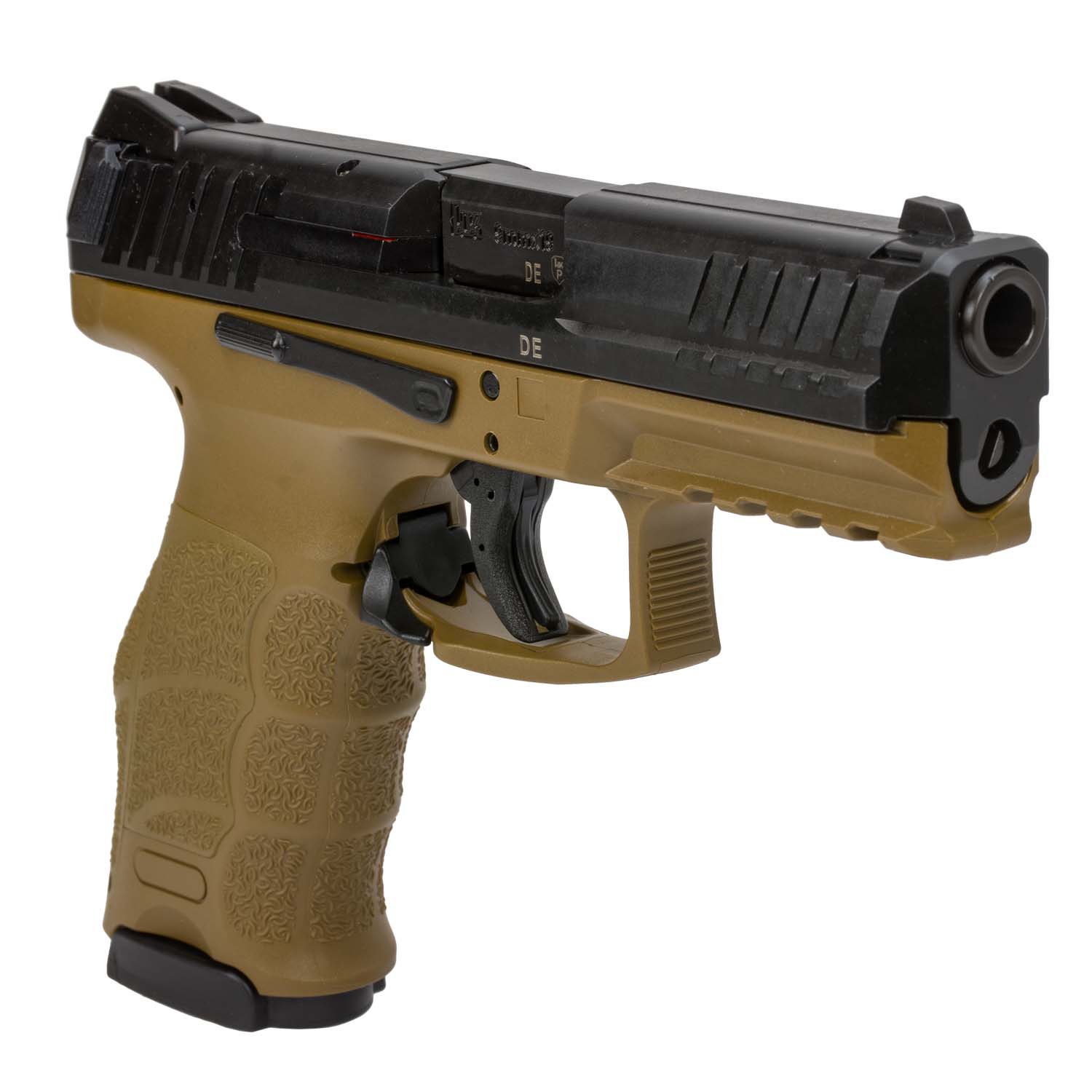 Description: Heckler & Koch VP9 9mm with Two 17rd. Magazines, FDE. Boasting a two-tone black and flat dark earth coloring, this 9mm VP9 pistol from HK features an ergonomic and adjustable grip, best-in-class trigger, precision strike trigger control system and ambidextrous controls to fit any shooter. This 9mm chambered pistol includes standard 3-dot luminescent sights installed, ships with (2) 17 round magazines, (3) sets of grips (small, medium & large) to customize your frame and a magazine speed loader.