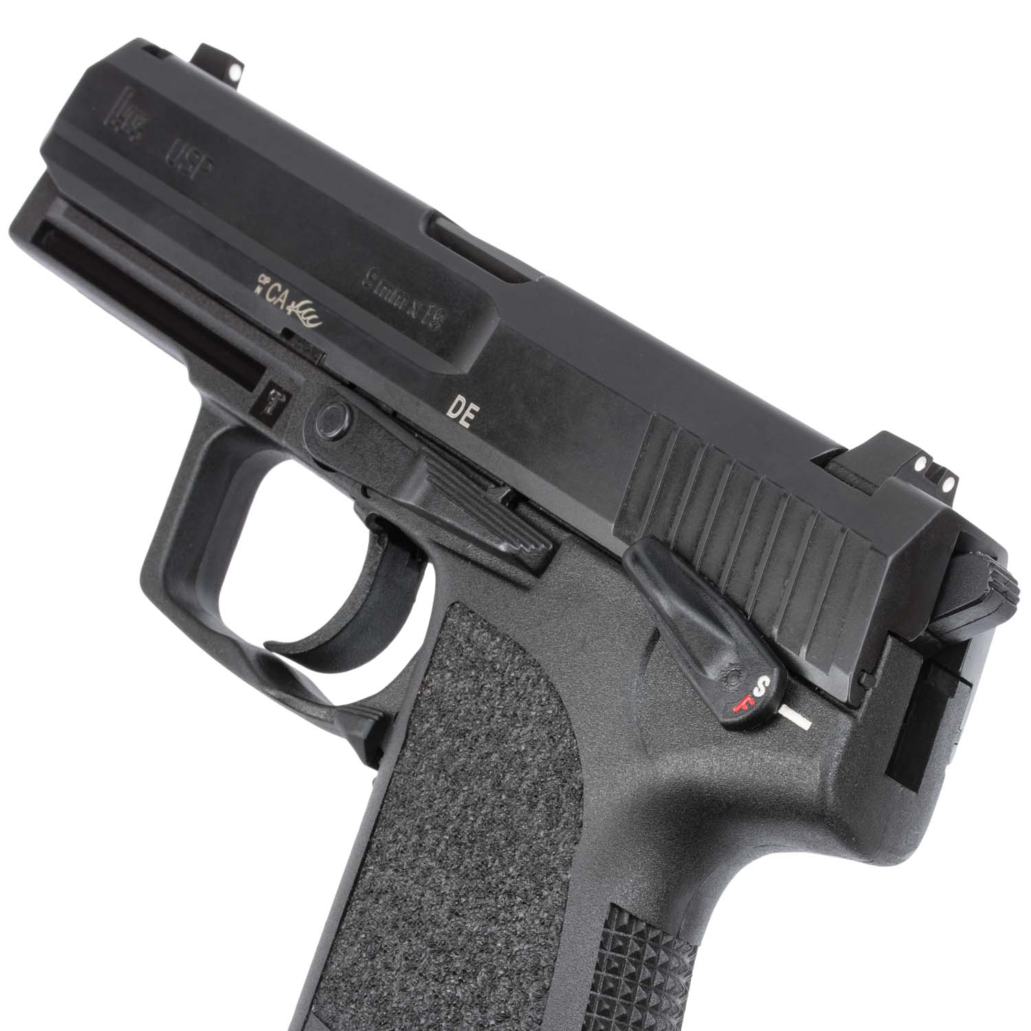A right-handed safety is installed on the USP though the inherent design of the firearm allows it to be switched to the other side for lefties. The safety also acts as a decocker for the pistol.
