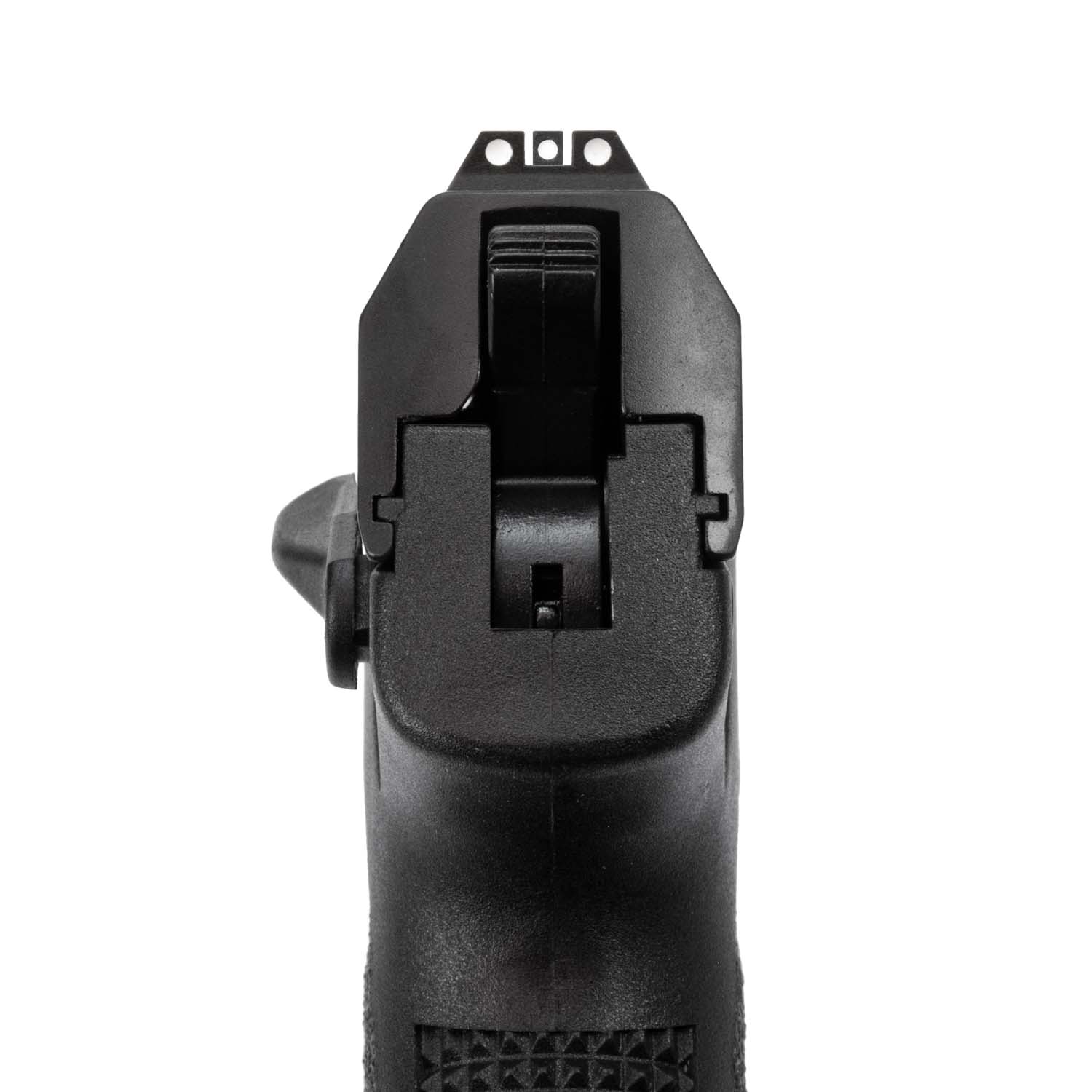 The USP features a front and rear set of fixed white dot sights installed on the slide.