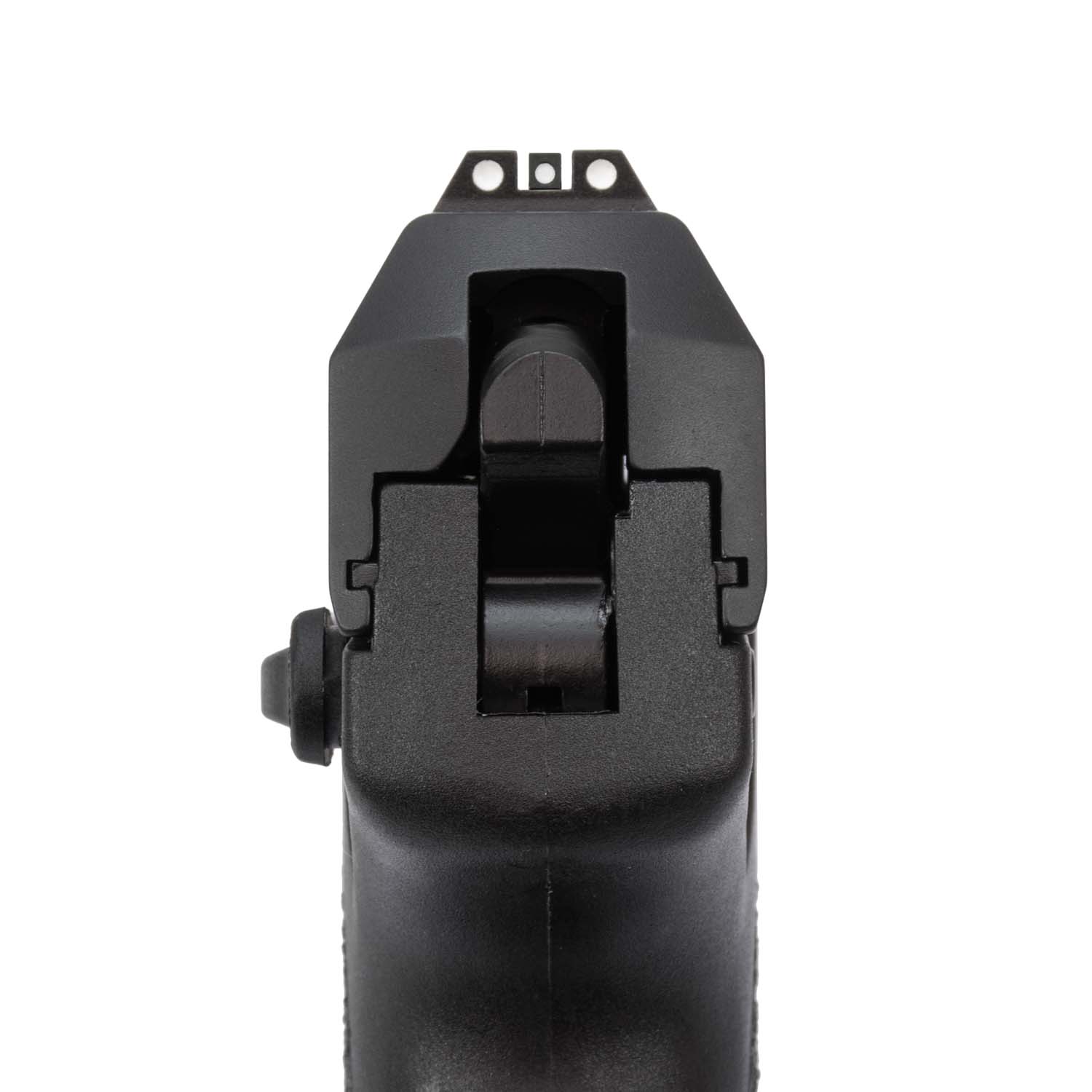 The USP Compact features a front and rear set of fixed white dot sights installed on the slide.