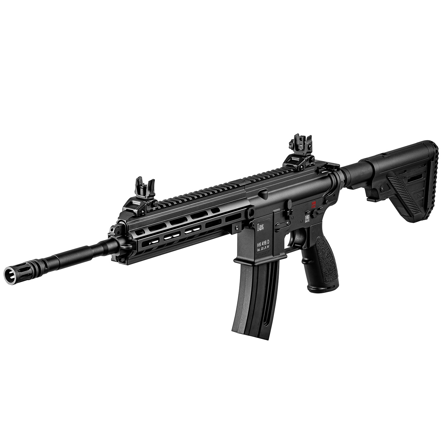 Description: Heckler & Koch HK416 .22 LR Rifle, 20 Round Magazine. Resembling its larger caliber brother, this .22 LR chambered HK 416 rifle version is the only official rimfire variant of the HK416 firearm. This lighter, smaller caliber, rifle features a genuine HK blowback operating system and not only looks and feels like the larger caliber version; albeit just under 6 pounds. Shipping with a 20 round magazine, the HK416 rimfire also features flip-up adjustable sights installed, an adjustable stock, 1/2" x 28 TPI barrel threads, A2 style flash hider and a 9" handguard with an M-LOK and Mil-Spec 1913 rail accessory system. The HK416 is the ultimate platform for a fun day of plinking or as a training rifle that offers similar functions and operations as larger caliber variants. Expand your arsenal with the proven quality of an HK firearm.