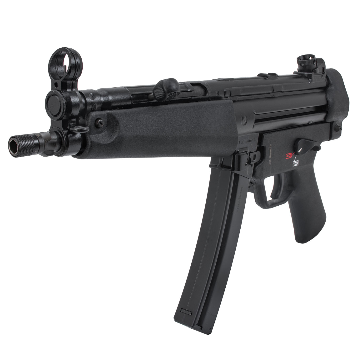 Description: Heckler & Koch SP5 9mm Pistol, 30 Round Magazines. Accept no imitations, the genuine civilian version of the classic MP5 pistol-caliber carbine is now available in this SP5 semi-auto model from Heckler and Koch chambered in 9mm. Keeping all of the notable aspects from the MP5, the HK SP5 roller delayed blowback pistol features a Navy barrel, paddle mag release, chrome-lined bore, fluted chamber, elevation / windage adjustable drum sight and 1/2" x 28 threading with a tri-lug adapter for suppressor installation. This pistol ships in a quality crafted case, comes with 2 30 round 9mm magazines and a comfortable bungee sling which installs to the end cap's swivel and the sling point on the magazine well.