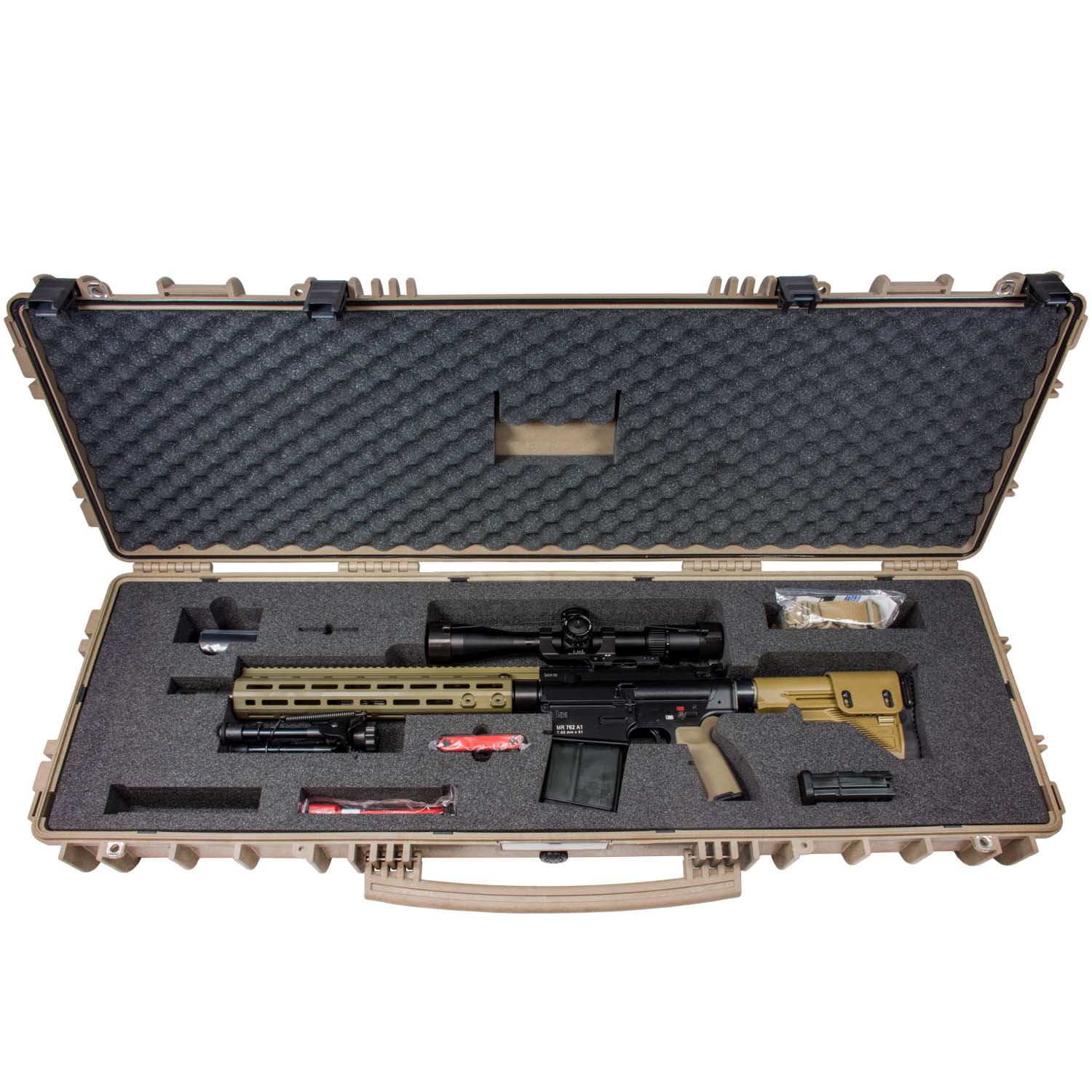 The rifle ships in an air-tight fitted hard tactical case which boasts an FDE color, travel wheels, sturdy handles, air purge dial and an overall durable design. The HK logo is embedded on the outside of the case.