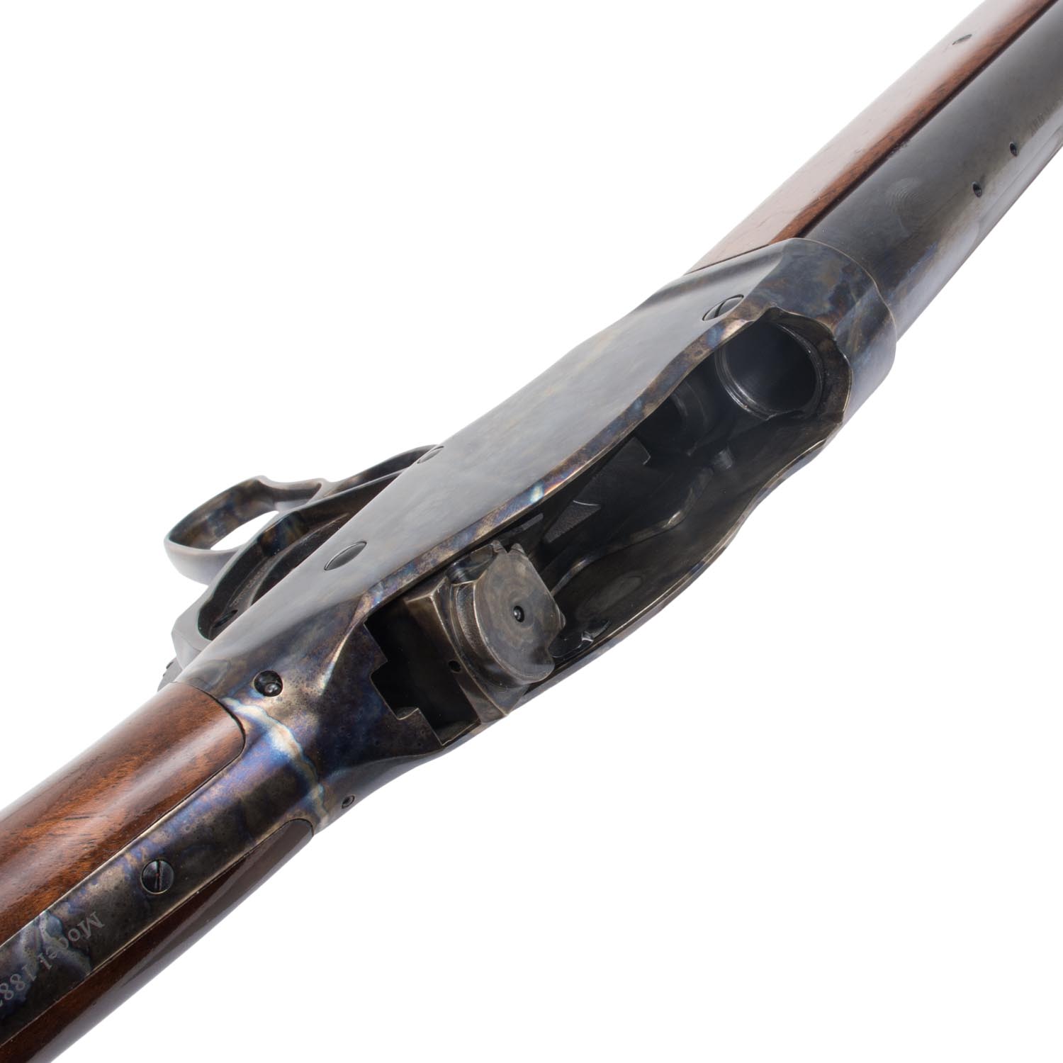 Description: Chiappa 1887 Shotgun Mares Leg, 12ga. 18.5" Barrel. The 1887, or Mares Leg, from Chiappa is a compact solid shotgun model utilizing a lever action and a pistol grip stock. The 18.5" blued barrel is chambered for 2-3/4" 12 gauge shells and holds 5 rounds in the magazine tube. The robust construction of this firearm is felt with every throw of the lever. The case coloring on the receiver/lever and the hand-oiled walnut grip/forend make this firearm a great functional showpiece for any collector.
