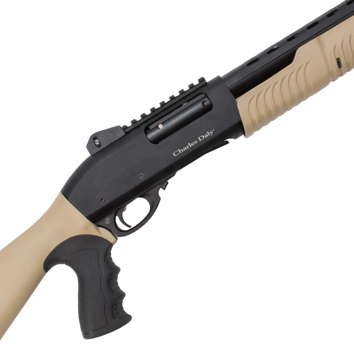 Description: Charles Daly 301 Tactical Pump Shotgun, 12ga. 18.5" Barrel, FDE Stock & Forend. This pump-action Charles Daly 301 12 gauge shotgun is a great choice for affordable home defense needs. Accepting 3" shells in the 5 round magazine tube, this 301 Tactical features an 18.5" steel barrel and a Ghost Ring rear sight installed behind the Picatinny top rail. The shotgun has sling attachment points at the end of the FDE forearm and on the synthetic FDE stock with a black pistol grip. This Charles Daly firearm carries the Mobilechoke choke tube system in the barrel. Expand your defense needs with this tactical go-to 301 shotgun from Charles Daly.