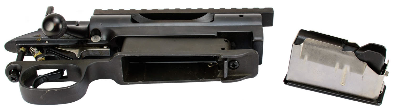 Description: FN Complete Short Action Receiver With 1 Piece Scope Rail And DBM Bottom Metal. Made by FN America using the proven Winchester Model 70 action. These were complete rifles at one time, but the barrels and stocks have been removed. The bolt included with these actions is a control round feed bolt. The bolt face measures .473" (Standard Bolt Face). These actions may have slight cosmetic blemishes from long term storage, however mechanically these actions are sound. This is your chance to build a custom FN / Winchester Rifle to your exact standards! Each action comes complete with the receiver, bolt, bottom metal, and detachable short action box magazine. All you need is a barrel and stock of your choice.