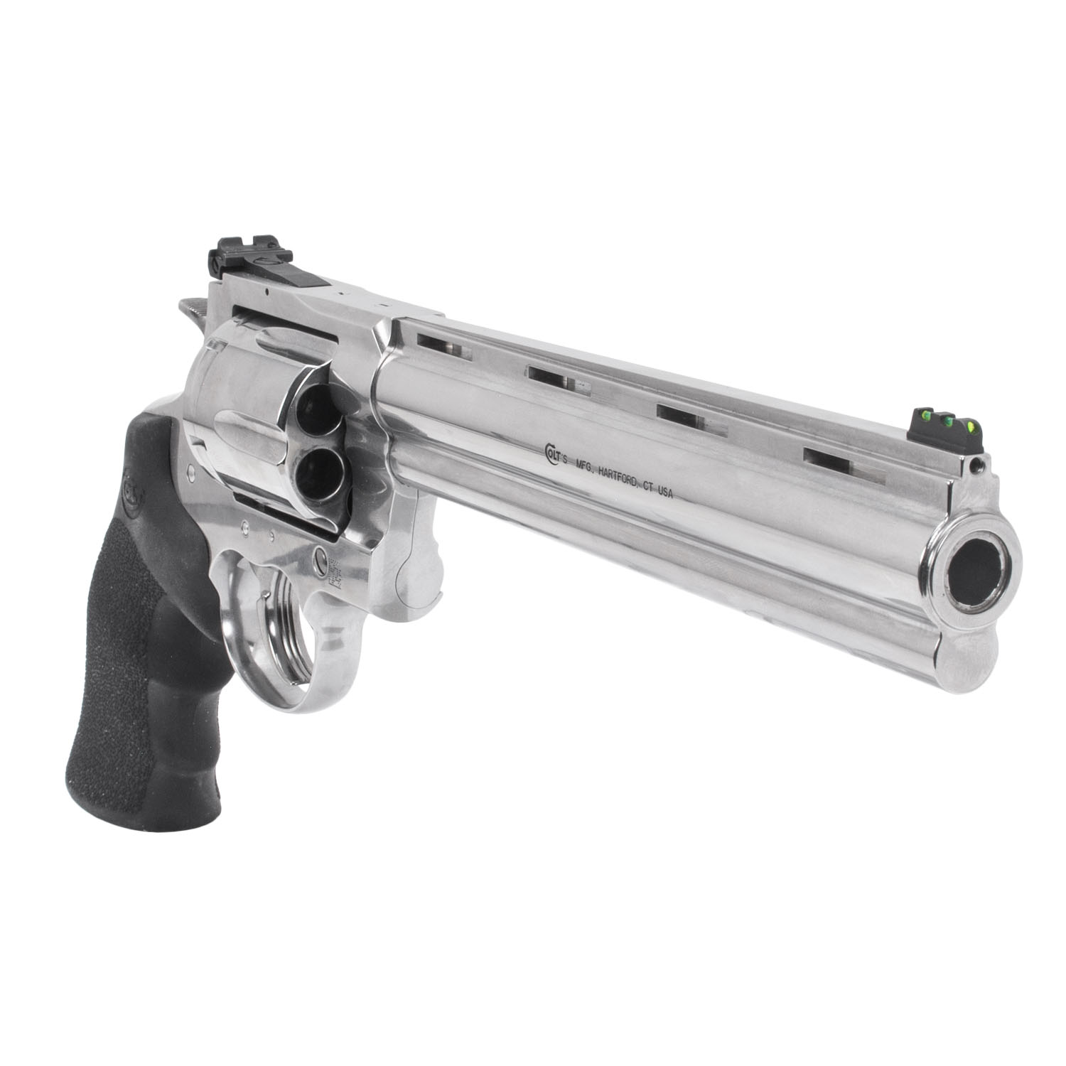 Description: Colt Anaconda Target .44 Magnum Revolver, Stainless w/ Rubber Grip, 8" Barrel. Thoughtfully engineered for the powerful 44 Rem Mag round, the Target Anaconda edition revolver from Colt features an 8 inch barrel with stainless steel construction. This double or single action 6-shot revolver has a Hogue OverMolded rubber grip against the stainless steel frame / cylinder. The rear sight of this Anaconda is adjustable for both windage and elevation and the elevated front sight has a green fiber optic tube for clear and crisp targeting. Grab this eye-catching revolver today to expand your firearm collection.